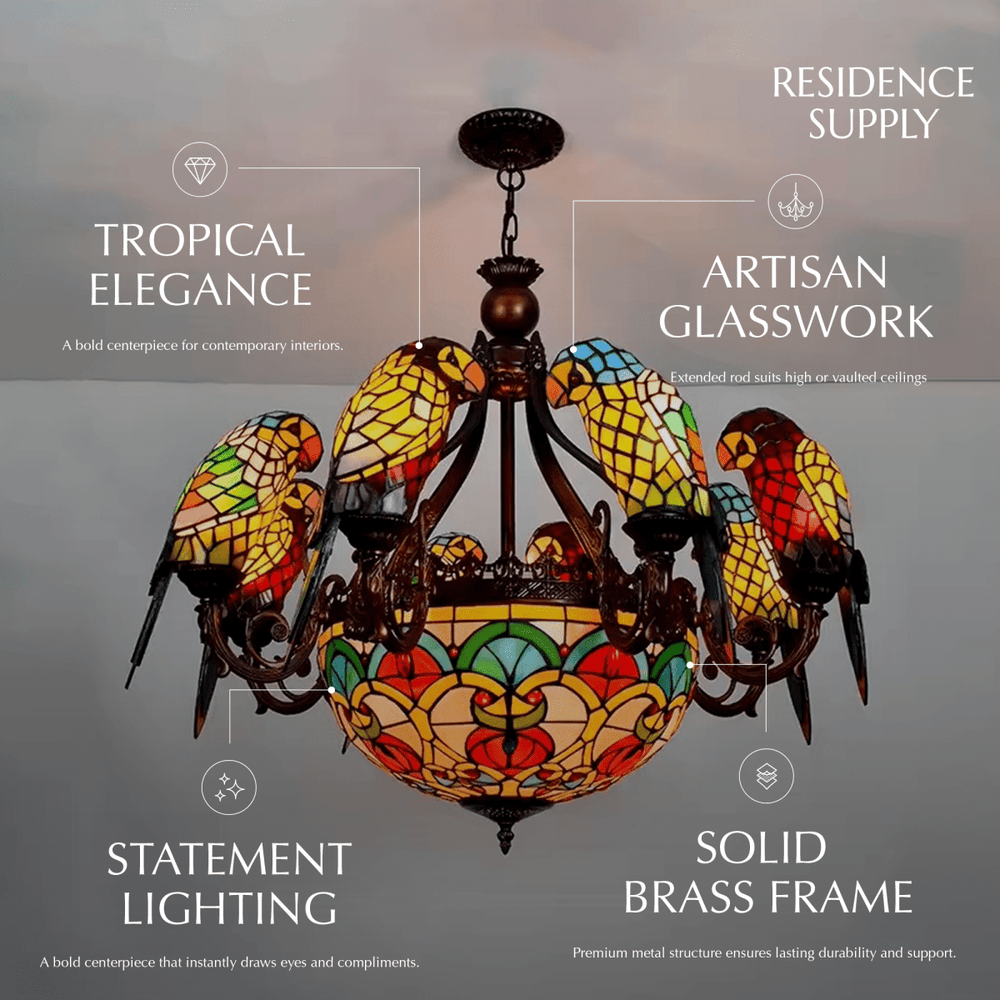 The Glass Parrot Chandelier is crafted from durable metals and high-quality glass materials, ensuring both longevity and a sophisticated aesthetic that adds a touch of rustic charm to any space.