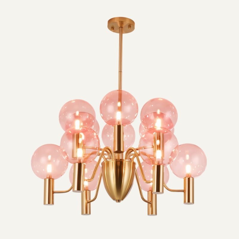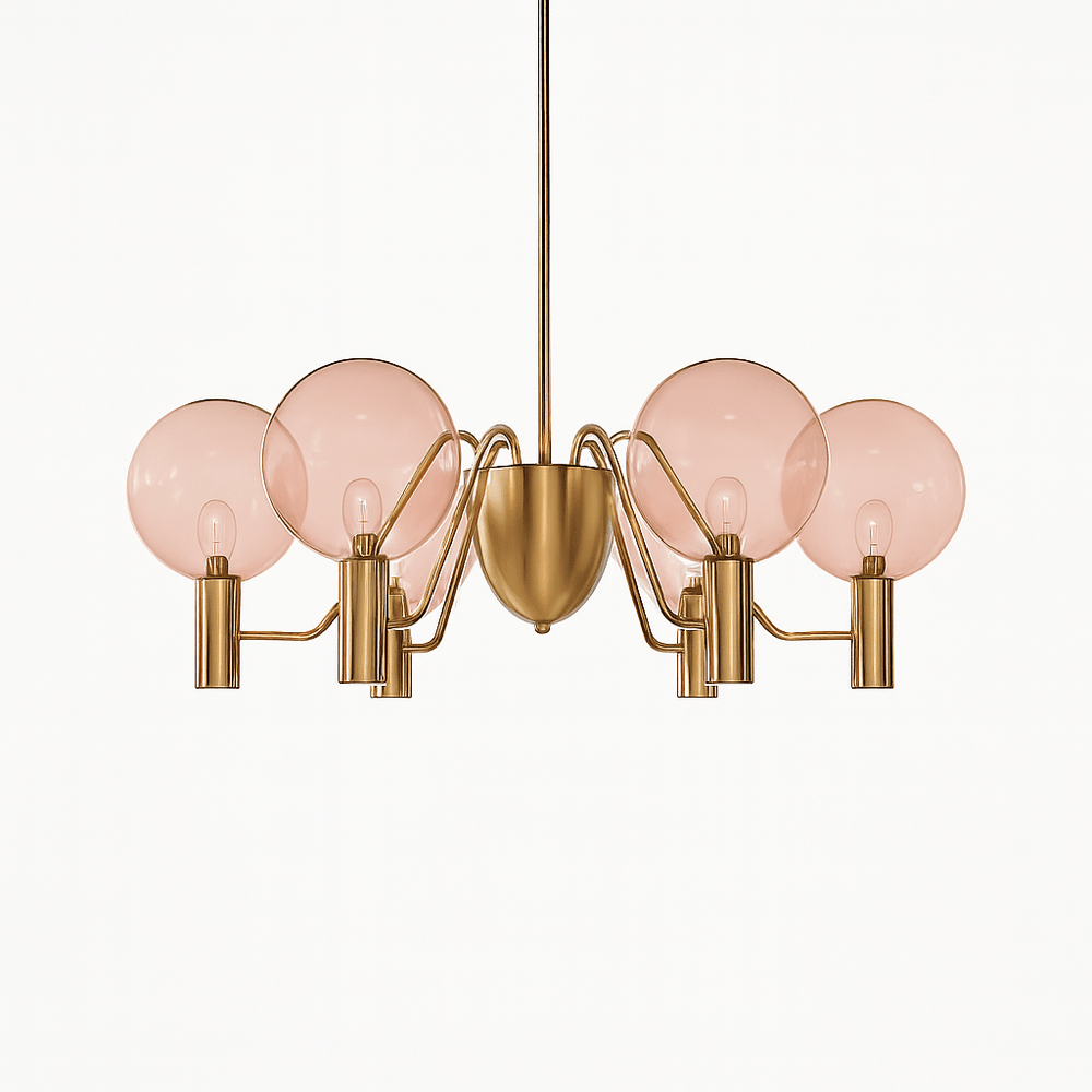 The Gloral Chandelier comes with polished glass spheres in two colors: Pink or Amber, allowing you to choose the one that best fits your decor.