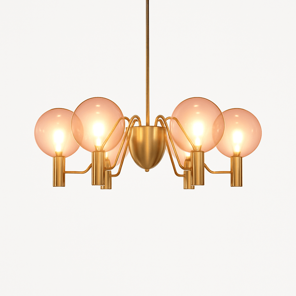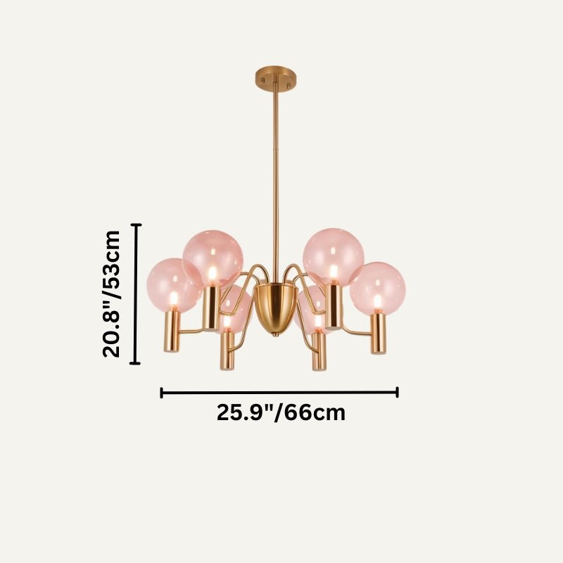 Gloral Chandelier has a golden-finished iron frame with curved arms that hold polished glass spheres. Available in Pink or Amber glass, it offers options to suit different decor styles. The design is both elegant and modern, with the glass spheres providing soft, diffused light. Ideal for living rooms, dining areas, and stylish commercial spaces, this chandelier adds both light and beauty to any setting.