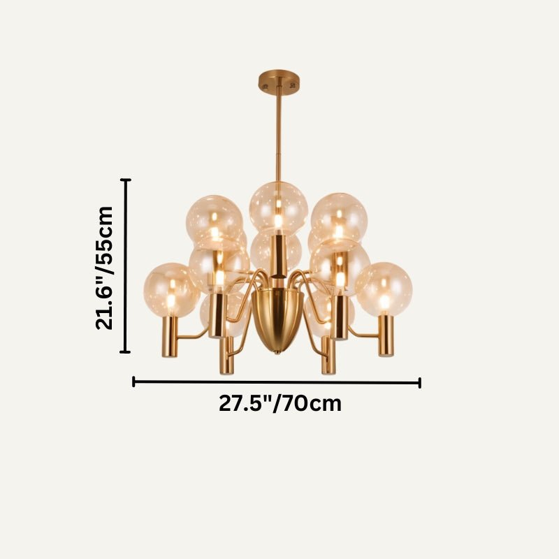 The Gloral Chandelier features a golden-finished iron frame and polished glass spheres. The iron provides durability and a luxurious look, while the glass spheres, available in Pink or Amber, enhance the chandelier's elegant design.