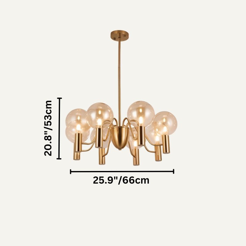 The chandelier’s golden-finished iron frame and gracefully curved arms provide a luxurious, sophisticated look. The polished glass spheres diffuse light softly, creating a warm and inviting ambiance, making it ideal for elevating any room’s decor.