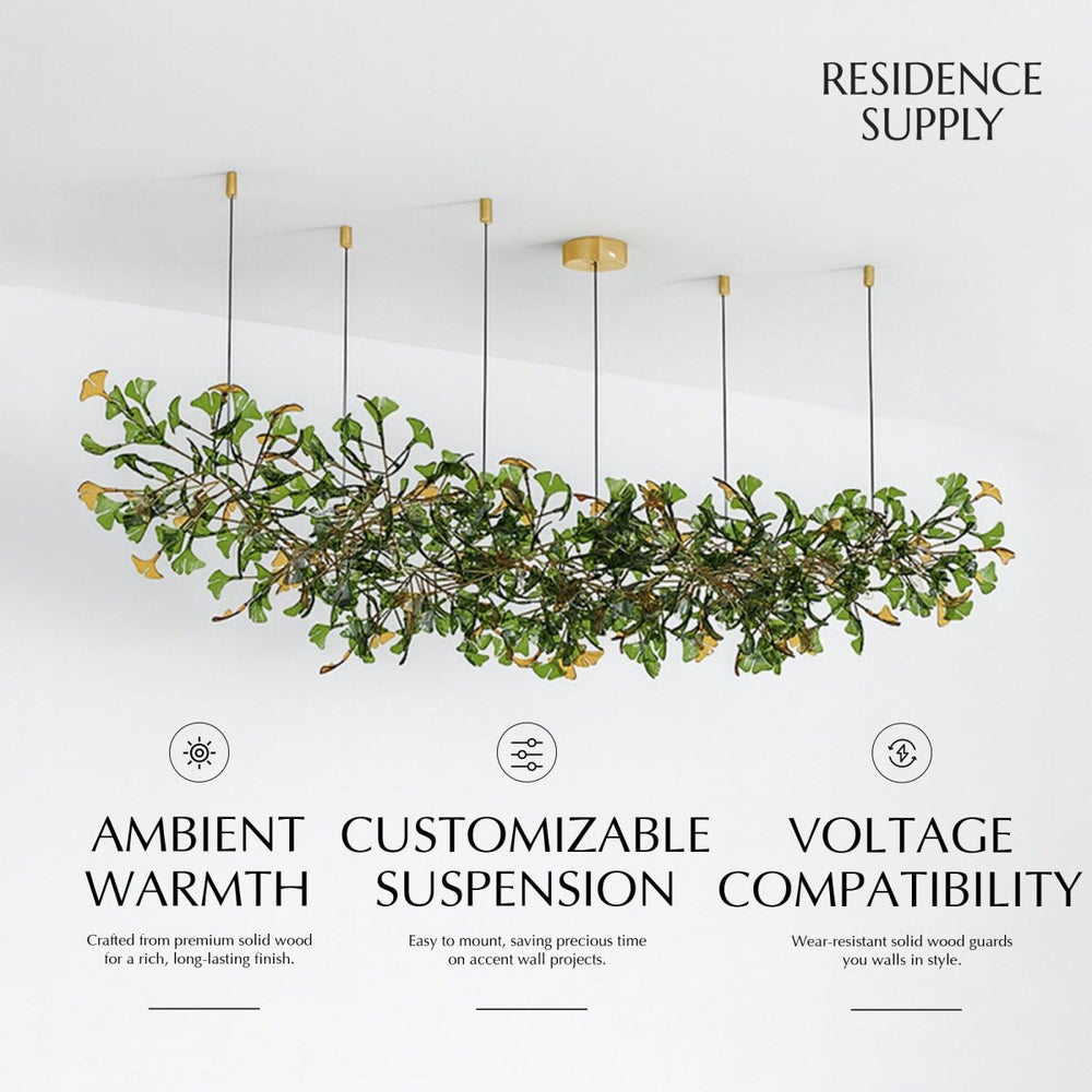 Copper and glass construction mimics ginkgo leaves for a natural, refined chandelier aesthetic.