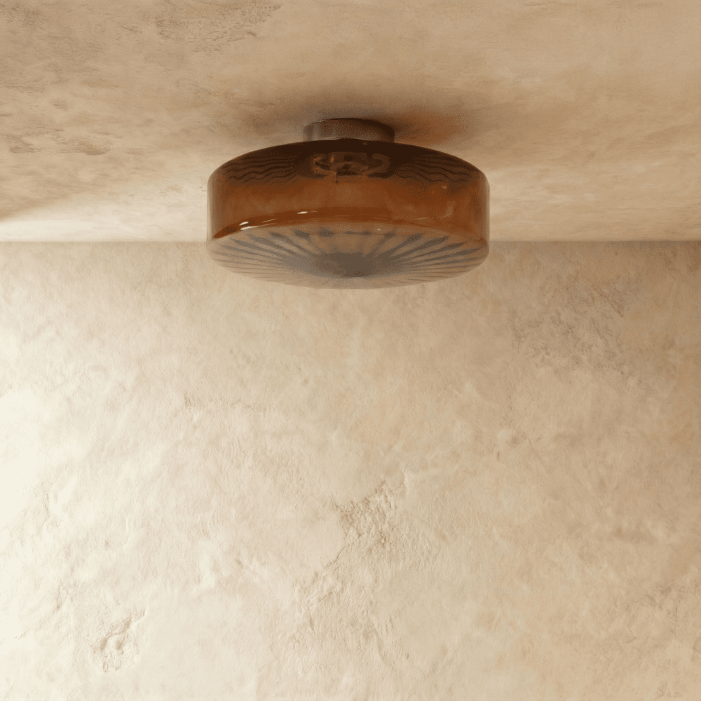 The textured glass lampshade of the Hasos Ceiling Light diffuses light softly, creating a warm and inviting atmosphere. This design feature ensures that the light is evenly distributed, reducing harsh shadows and glare, which enhances the overall ambiance of the room. The ripple effect in the glass adds a vintage charm while maintaining a cozy, elegant glow suitable for various interior decor styles.