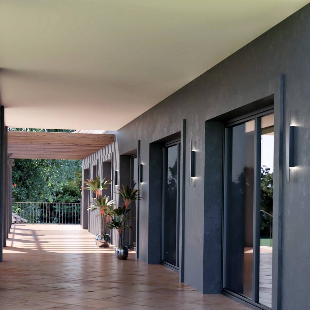 The Indira Outdoor Wall Lamp enhances outdoor aesthetics with its modern, minimal design, vibrant and warm illumination, and sleek aluminum finish, creating an artistic lighting effect that complements various exterior decors and architectural styles.