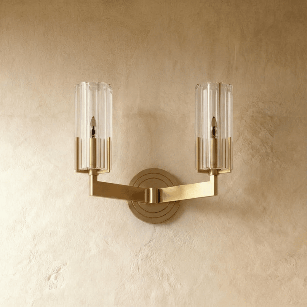 Features a sleek brass base and cylindrical glass shades for timeless sophistication.