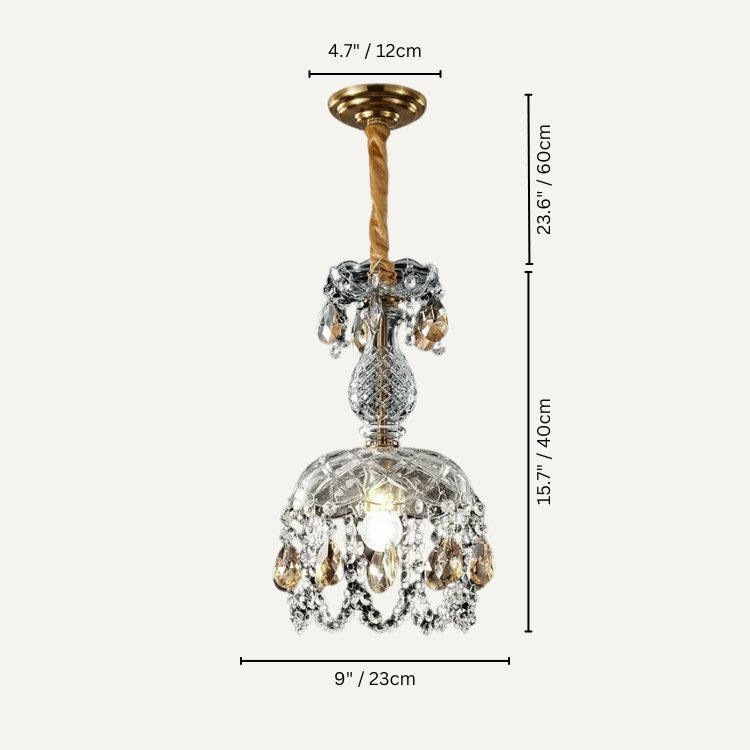 The Kajani Pendant Light is constructed from high-quality copper and features intricate glass craftsmanship adorned with retro crystal accents, ensuring a timeless and classic vintage look. For installation, it's recommended to use a professional installer to ensure safety and proper setup.