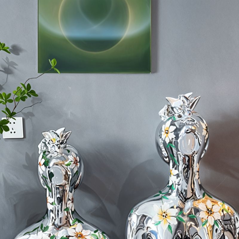 The Khloris Figurine's electroplated gold or chrome finish is designed to be both durable and visually stunning, maintaining its lustrous appeal over time. Crafted from high-quality, non-toxic resin and painted with high-grade, non-toxic paints, it ensures not only longevity but also the health and safety of your living space. The superior craftsmanship and innovative design mean that this figurine will continue to be a captivating focal point in any room, whether on a coffee table, desk, shelf, or console table.