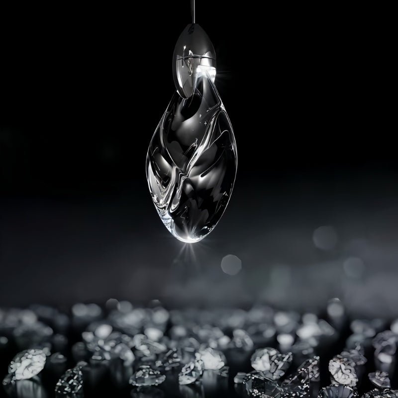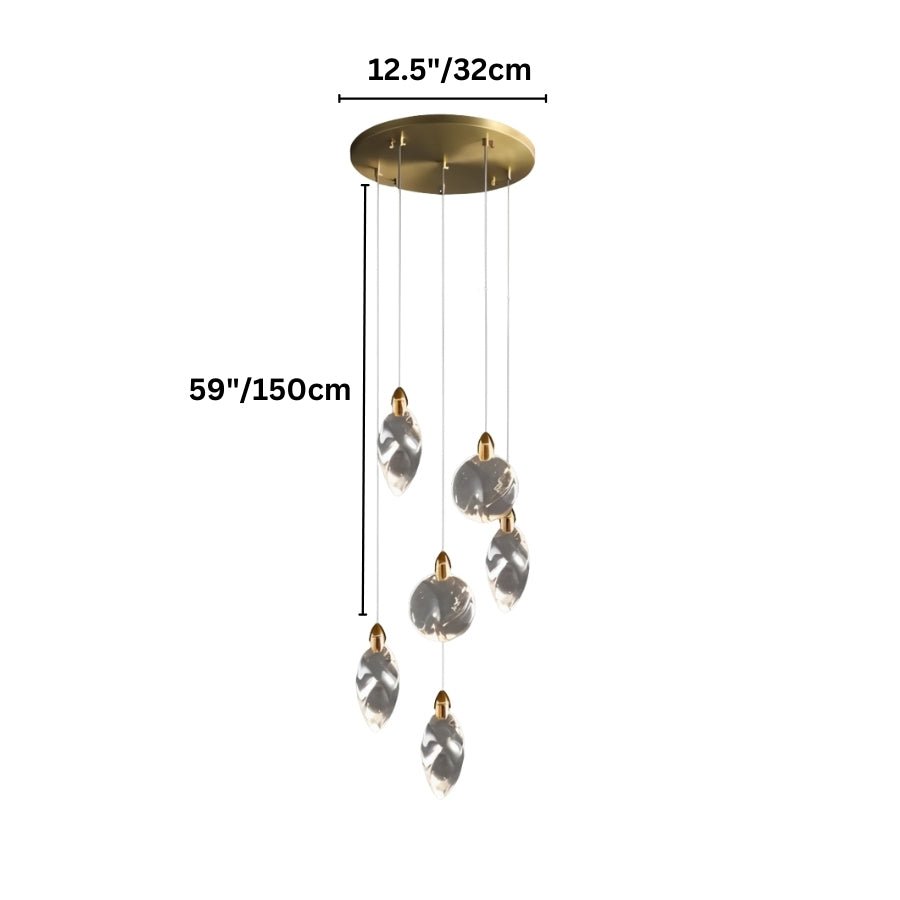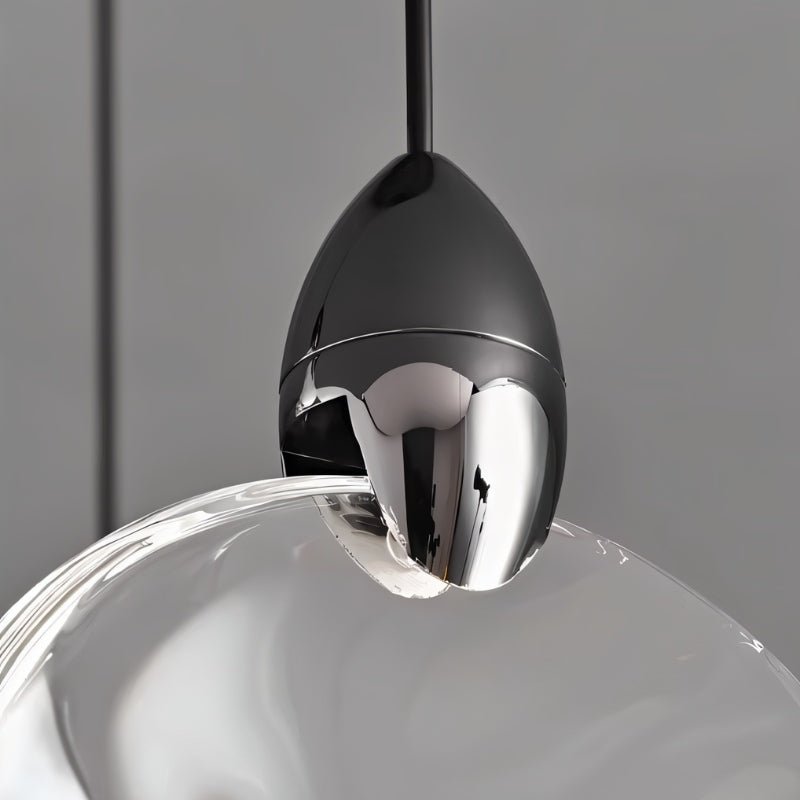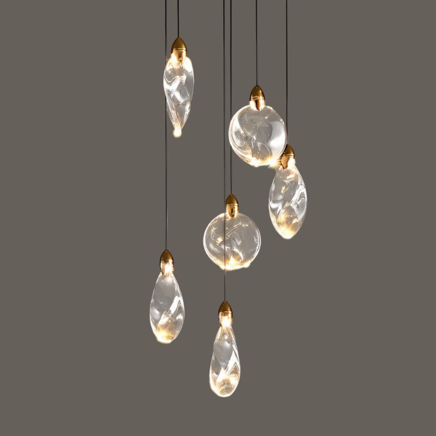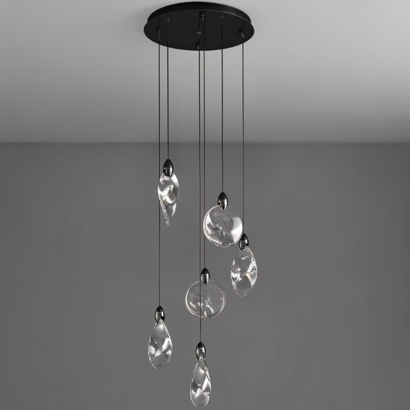 The Lufina pendant light features a minimalist design with elegant crystal droplets suspended from a sleek, black iron canopy. Each crystal teardrop is uniquely shaped, diffusing a warm glow that cascades down the fixture, enhancing its sculptural allure. The varying drop lengths create a cascading effect, perfect for staircases or high-ceiling spaces. This modern, art-inspired design brings a sophisticated ambiance to any interior.