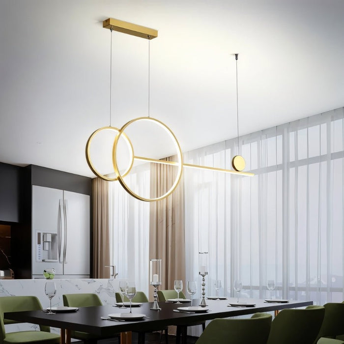 Lyzaro Pendant Light features a striking design with two interconnected circular rings in sleek black or gold finishes, offering a bold, modern aesthetic. Crafted from durable acrylic and iron, this light fixture emits a soft, ambient glow that enhances contemporary interiors. The minimalist yet sophisticated design makes it ideal for installation above kitchen islands, dining areas, or modern living rooms. With its geometric shapes and clean design, this pendant light adds a touch of elegance and style to any space.