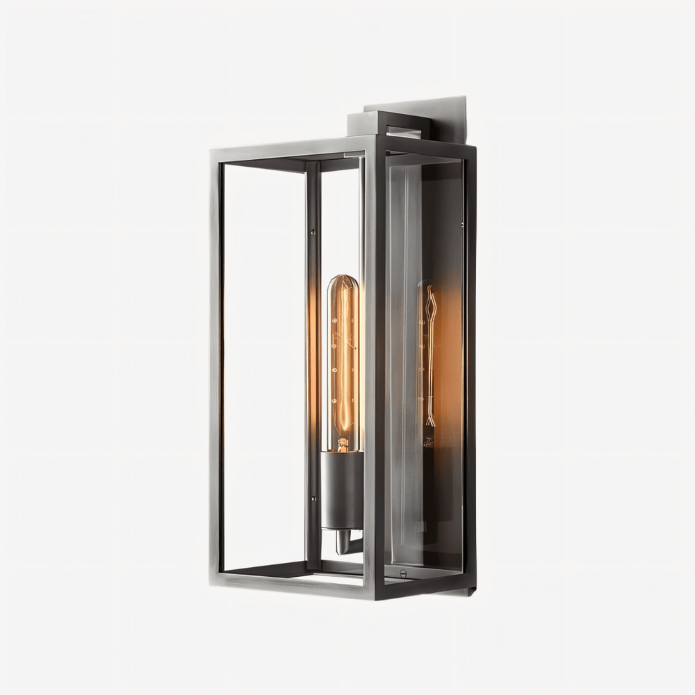 Matkon Wall Lamp is a refined light fixture crafted from copper and glass, showcasing a sleek rectangular frame with a clean geometric design. The transparent glass panels enclose two elongated bulbs, creating a balanced composition that blends industrial structure with modern minimalism. Perfect for living rooms, bedrooms, or hallways, this wall lamp enhances interiors with its structured form and soft, ambient glow.