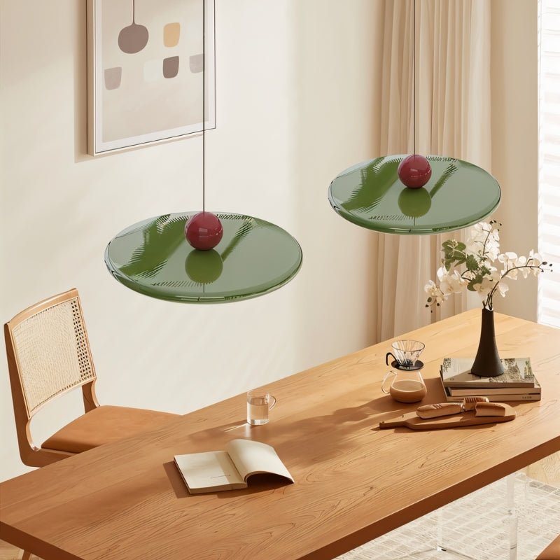 The Moyra Pendant Light features a sleek metal disc-shaped shade with a contrasting spherical accent, creating a bold yet minimalist design. Its soft, diffused illumination makes it an ideal light fixture for dining areas, kitchen islands, and modern living spaces. Suspended from a thin cord, it maintains a clean, uncluttered aesthetic while making a statement. Perfect for contemporary, Scandinavian, or eclectic interiors, it suits both residential and commercial settings.