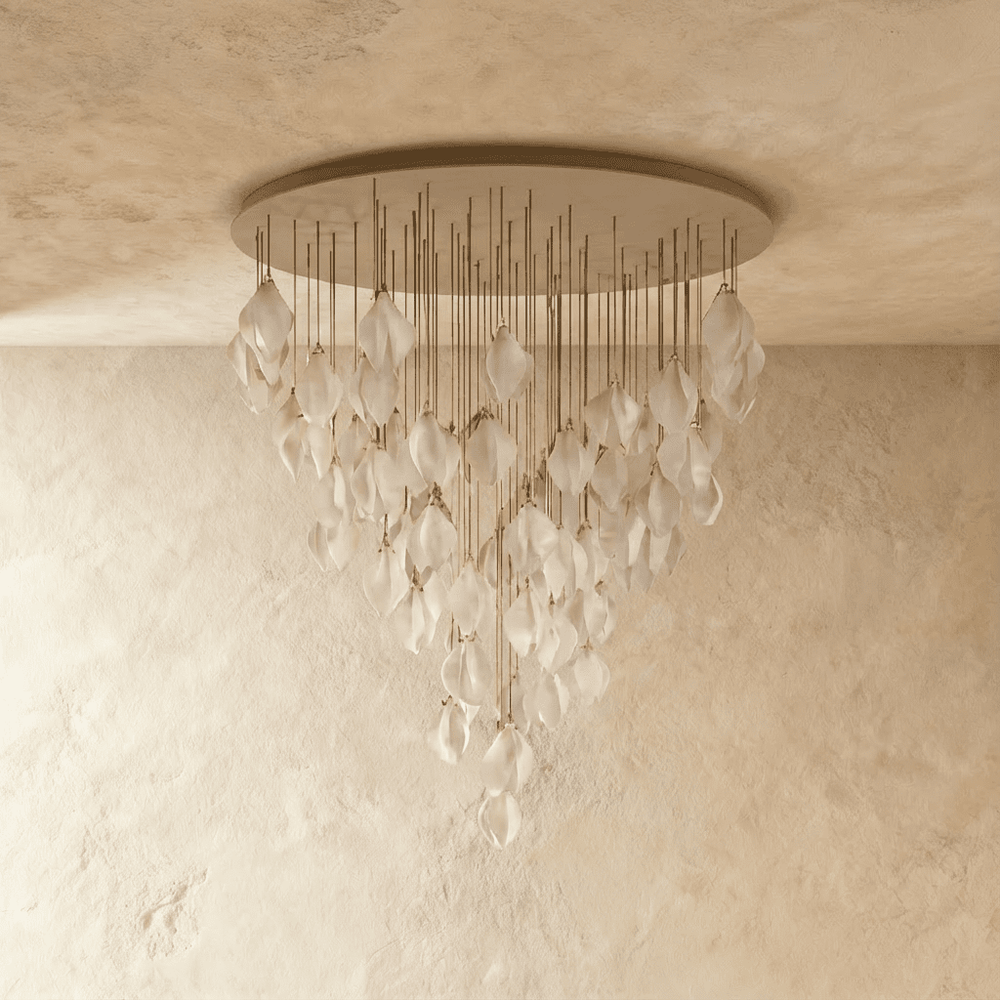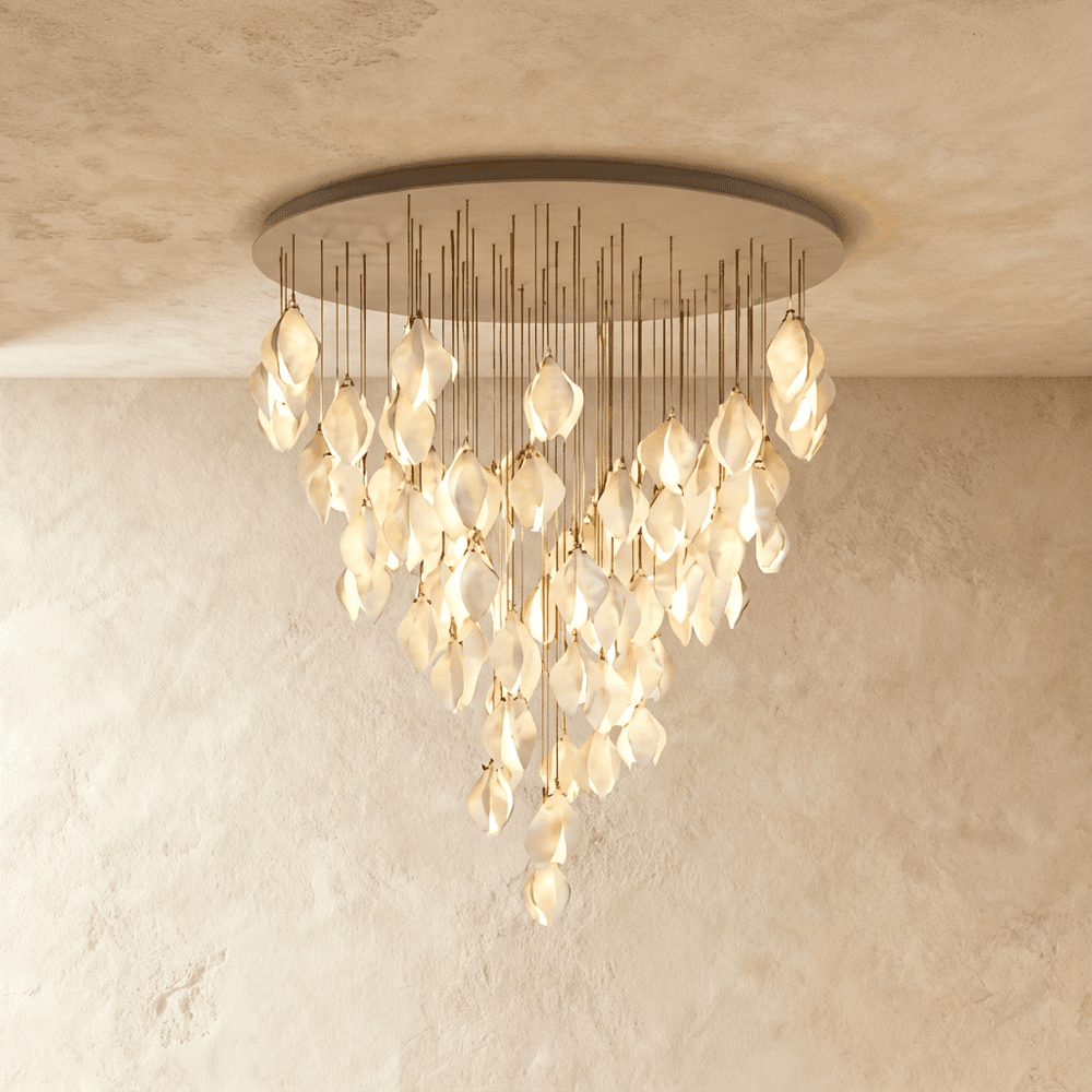 Its petal-inspired design, premium materials, and 55-bulb configuration make it a standout focal point in luxurious interiors.
