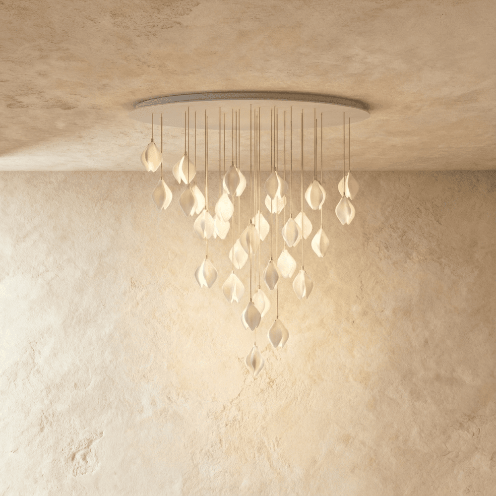 The Nica Chandelier is a modern light fixture featuring a stunning aluminum and porcelain construction. Its petal-inspired design exudes elegance, with a warm, diffused glow that enhances ambiance. Perfect for dining rooms, living areas, and entryways, this chandelier complements contemporary and luxurious interiors. Its unique aesthetic and durable materials make it a standout lighting choice for any space.