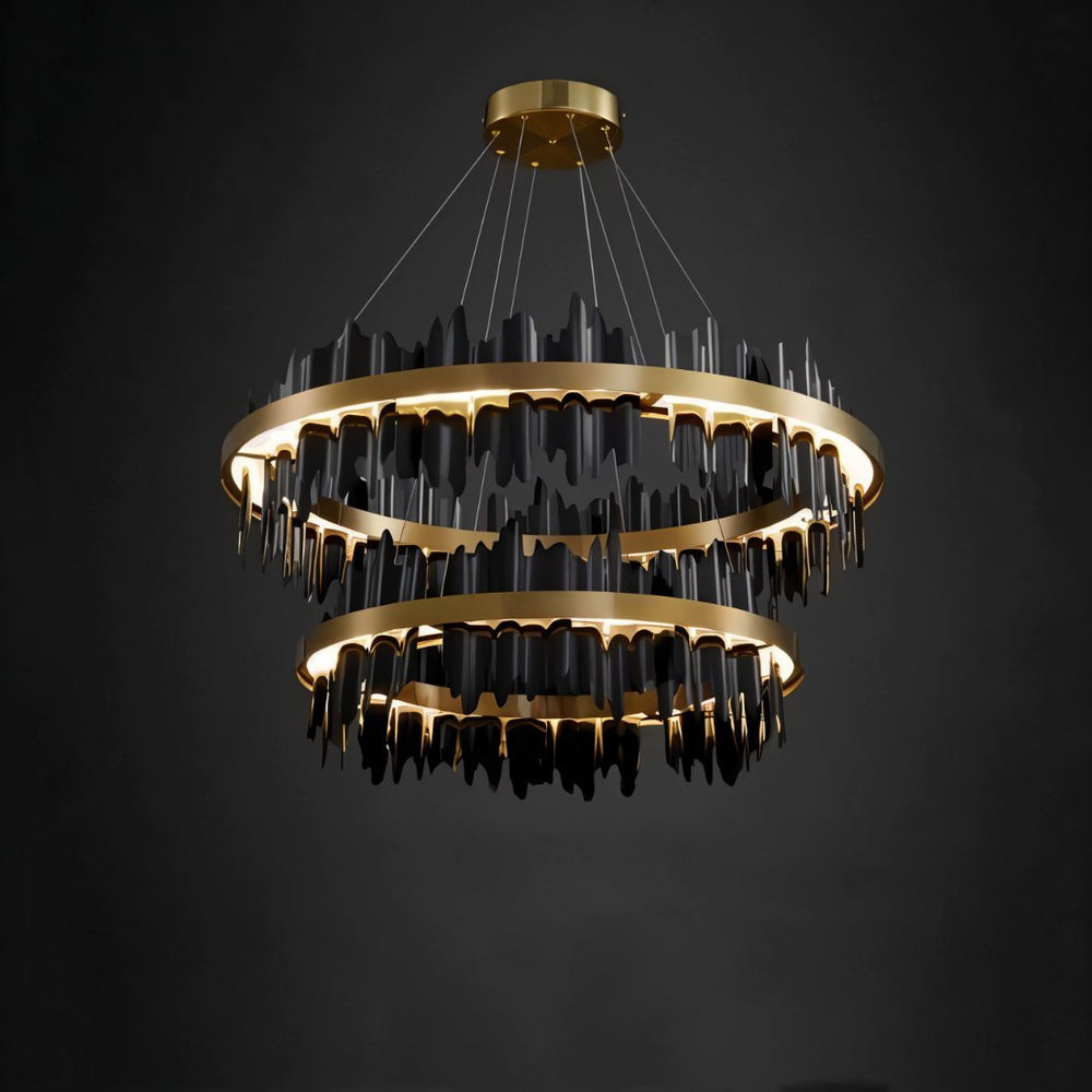 The Ninda Tiered Round Chandelier is an exquisite lighting fixture that expertly combines modern style with industrial charm, making it a perfect addition to enhance the ambiance and decor of interior spaces. This chandelier features a sophisticated design with crystal and metal frames, offering not only a touch of luxury but also providing warm, captivating, and adjustable lighting that is both dimmable and tunable from 3000K to 6000K. The dimensions of the chandelier include an overall size of 56"x38", with the top tier measuring 31.4"x18" and the lower tier 24"x18", making it a substantial centerpiece for any lounge or living area. Available in black and gold colors, it adds a decorative flair and visual appeal, while the expert craftsmanship ensures precision and attention to detail in every aspect. This chandelier is designed to elevate the atmosphere of any space, transcending mere functionality with its alluring presence and romantic, clear light.