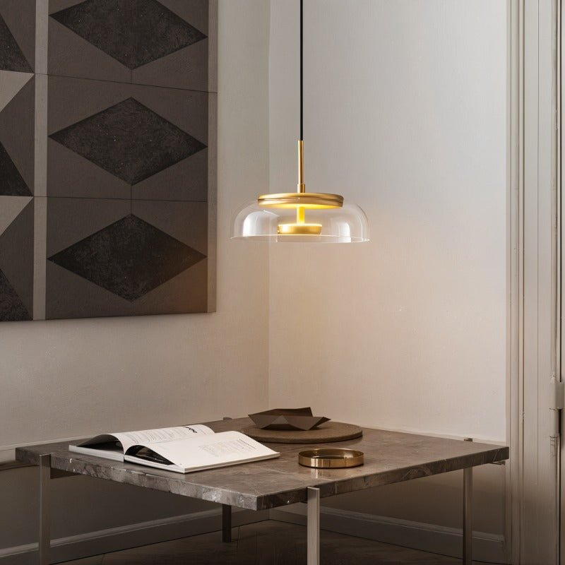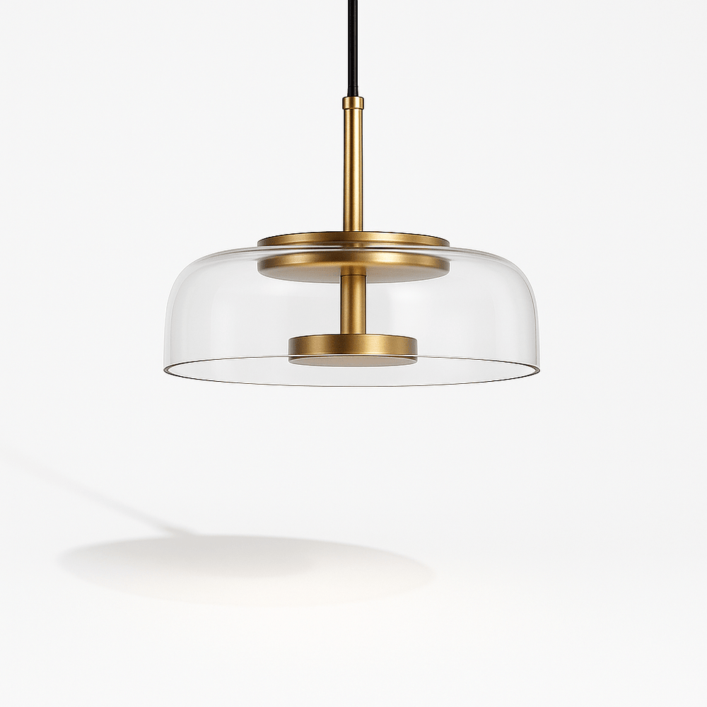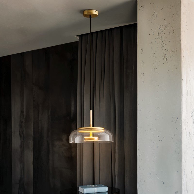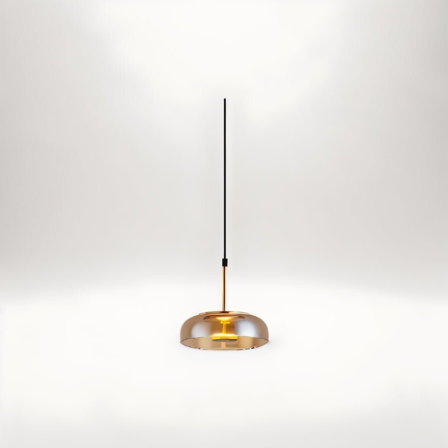 Product Dimensions: D9"(23cm) x H6.3"(16cm) Material: Iron, Glass Finish: Glass, Gold Light Source: Integrated LED Dimmable: Upon Request Voltage: 90-260VAC Installation Type: Hardwired Chain/Cord Length: Up to 3.3ft (1 meter) Sloped Ceiling Compatible?: Yes Certifications: UL, CCC, CE, CQC, EMC, FCC, GS, LVD, PSE, ROHS, SAA, and VDE