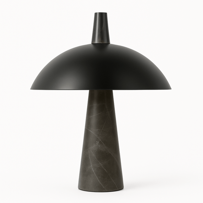 The Novexis Table Lamp is a sculptural light fixture combining a marble base with a steel dome shade. The conical stone foundation provides stability, while the curved metal shade directs warm illumination downward. Its minimalist yet striking form suits modern interiors, making it ideal for bedside tables, console surfaces, or office desks. Designed for ambient lighting, this fixture enhances spaces with its material contrast and architectural presence.