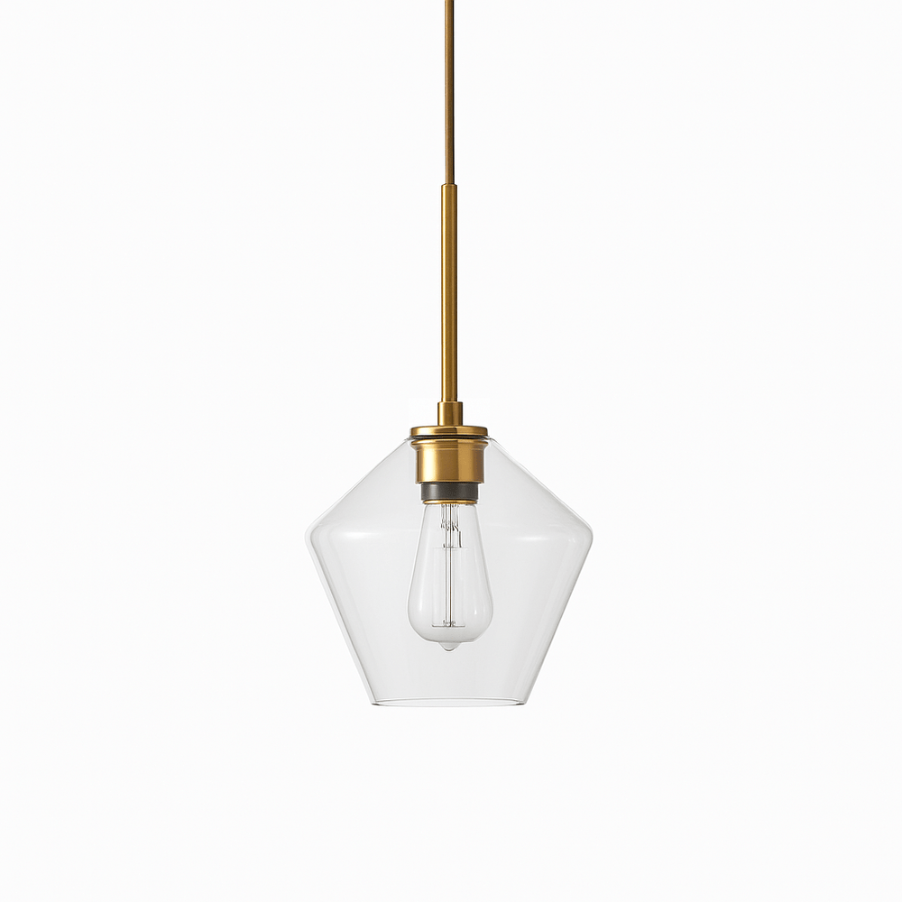 Geometric smoked-glass shades and brass-finished rods create a bold, stylish look.