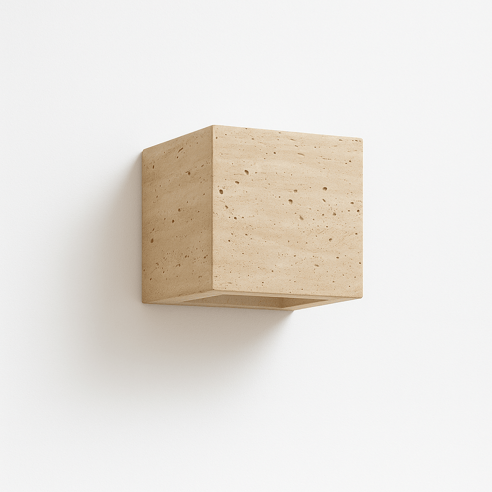 Phostic wall lamp is a sleek, modern light fixture crafted from yellow travertine. Available in rectangular and cube designs, it highlights natural stone textures, offering both functional lighting and a decorative element. The lamp emits a soft, ambient glow, perfect for creating a warm atmosphere. Ideal for indoor spaces like living rooms, hallways, or bedrooms, its minimalist form complements various wall placements. Its clean lines and natural material make it a standout design piece.