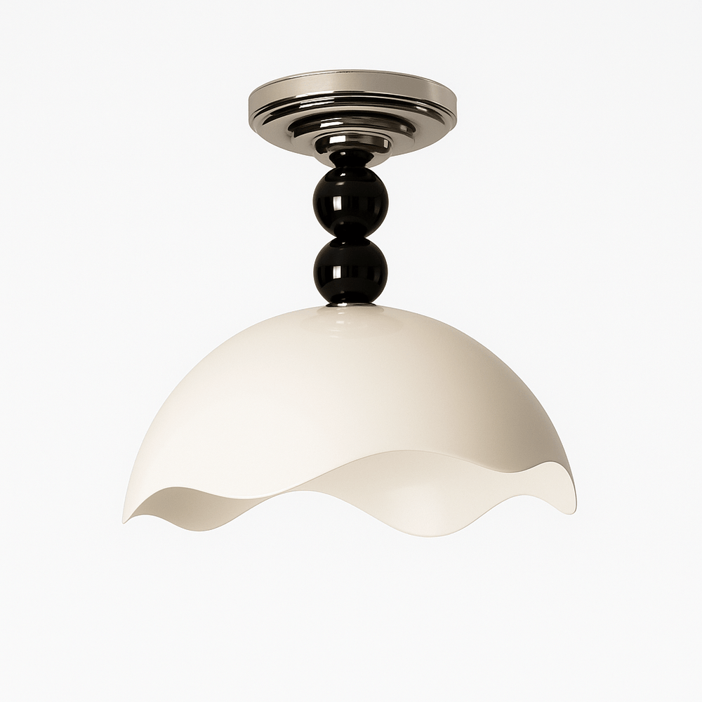 The Qyron Ceiling Light features a sculptural aluminum and iron design with a fluid, wave-edged shade, adding a modern touch to interiors. Its semi-flush mount structure is ideal for bedrooms, dining areas, and cozy living spaces. The glossy exterior contrasts with a smooth interior for balanced illumination. Available in two colors and sizes, it complements contemporary and minimalist aesthetics. This light fixture seamlessly blends form and function for stylish ambient lighting.