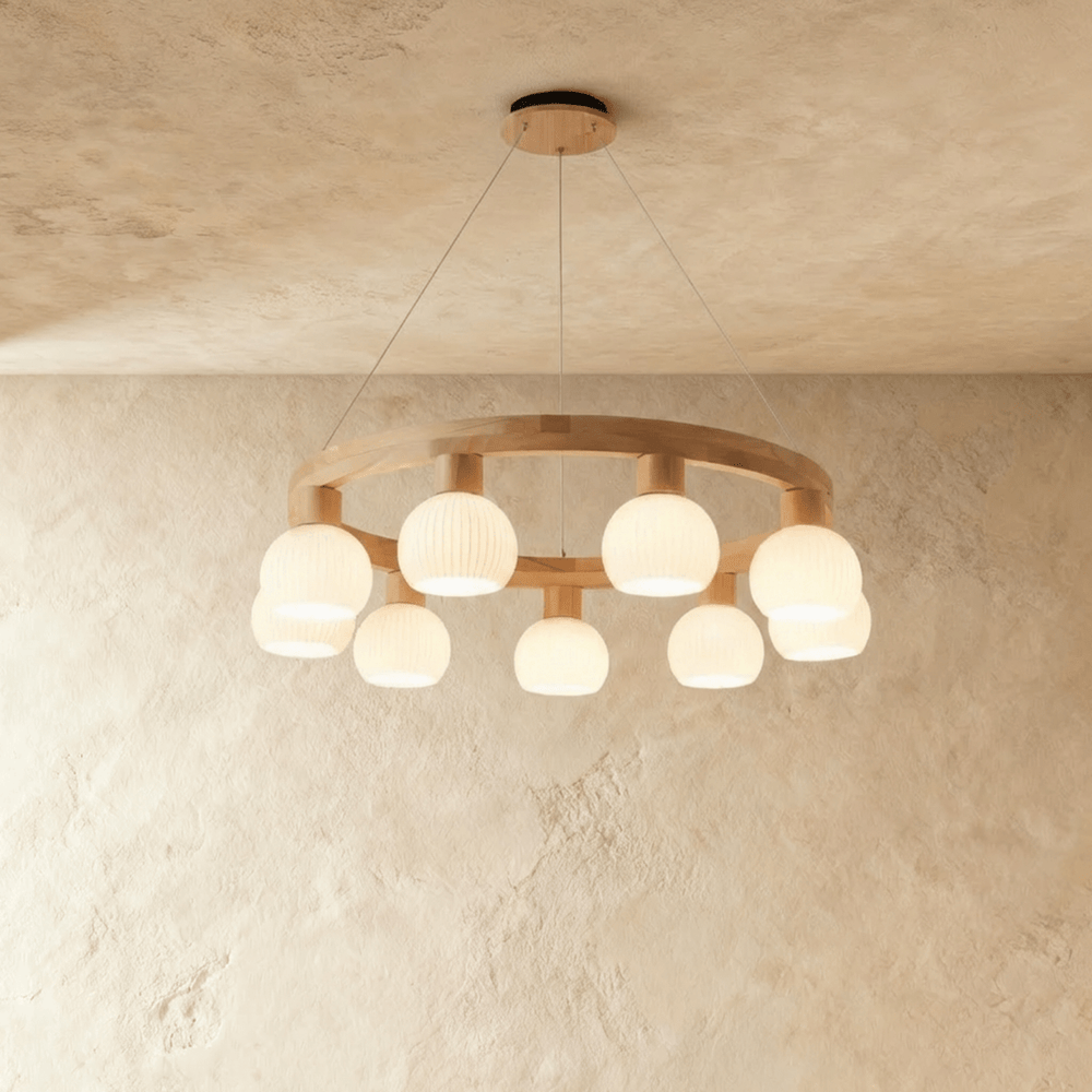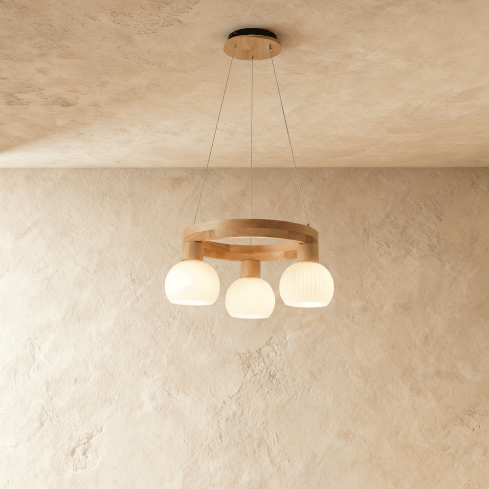 A circular wood frame with ribbed glass globes creates a warm, modern aesthetic.