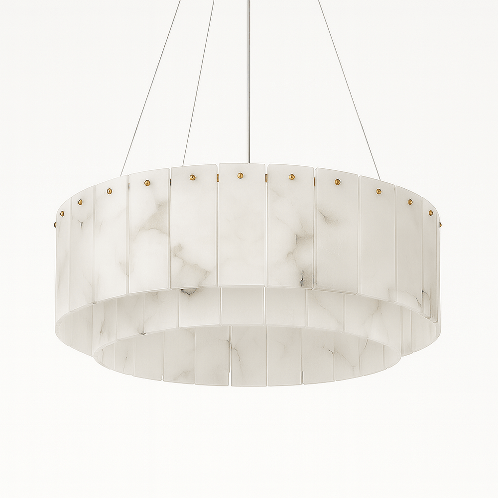 This chandelier blends metal and alabaster, showcasing translucent panels with marble-like aesthetics and unique veining. The striking contrast between the metal frame and alabaster creates an eye-catching focal point that sparks conversation and adds charm to any space.