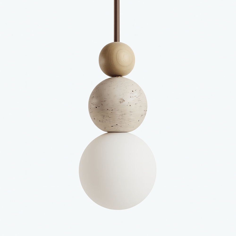 Rile pendant light features a sculptural design with stacked travertine, wood, and metal elements, supporting a frosted glass diffuser. This light fixture offers soft, ambient lighting, perfect for dining areas, kitchen islands, and modern living spaces. Its organic textures and geometric balance enhance contemporary and minimalist interiors.