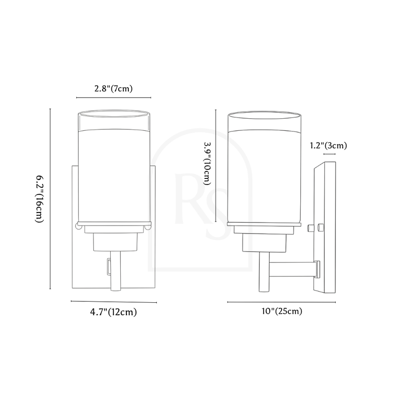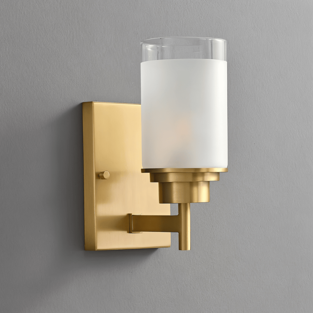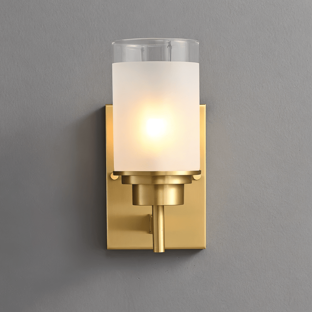 The Savro Wall Lamp is a modern wall-mounted light fixture made from copper and glass. A square copper backplate supports a slim arm and a cylindrical shade with frosted glass inside a clear outer layer, diffusing light with depth and softness. The brushed copper finish adds a warm metallic accent, making this wall lamp ideal for hallways, bedrooms, entryways, and living rooms.