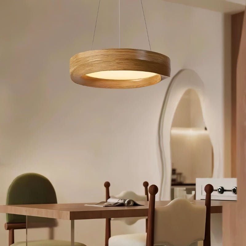 A wood-like finish and diffused acrylic panel provide soft, even illumination, creating a warm ambiance — perfect for modern dining rooms and living spaces.
