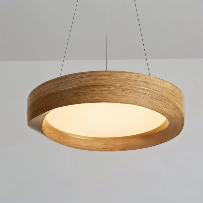 The Selion Pendant Light features a circular metal frame with a wood-like finish and a diffused acrylic panel for soft, even illumination. Suspended by thin cables, this minimalist light fixture creates a floating effect, enhancing modern dining rooms, kitchens, and living spaces. Its sleek design blends organic aesthetics with durable materials, making it ideal for residential and commercial interiors. This light fixture offers both style and functionality, delivering warm ambient lighting with a contemporary touch.