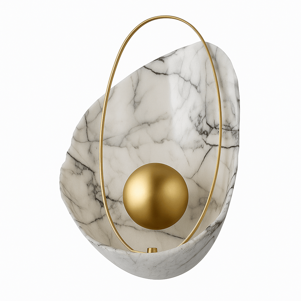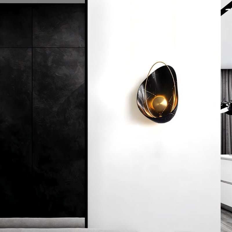 Sevlo wall lamp is a captivating light fixture that merges modern artistry with elegance. Featuring a unique shell-like shape, this lamp is crafted from resin with intricate black and white veining, evoking the look of natural stone. A sleek metal hoop—available in Iron or Brass—envelops the fixture, holding a gold-toned sphere in the center, which serves as the light source. The combination of resin and metal creates a striking contrast that enhances any interior space.