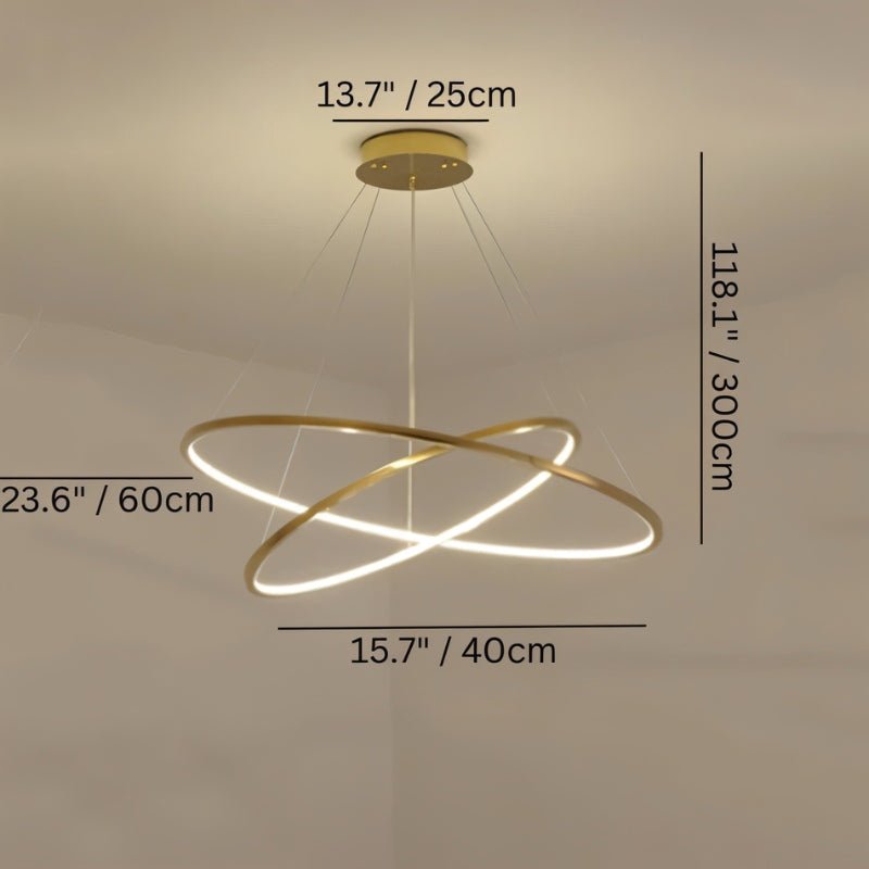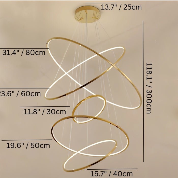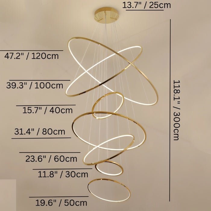 Product Dimensions: 2 Ring: 15.7" x 23.6" x 118.1" / 40 x 60 x 300cm, 3 Ring: 15.7" x 23.6" x 31.4" x 118.1" / 40 x 60 x 80 x 300cm, 4 Ring: 11.8" x 15.7" x 23.6" x 31.4" x 118.1" / 30 x 40 x 60 x 80 x 300cm, 5 Ring: 11.8" x 15.7" x 19.6" x 23.6" x 31.4" x 118.1" / 30 x 40 x 50 x 60 x 80 x 300cm, 6 Ring: 11.8" x 15.7" x 19.6" x 23.6" x 31.4" x 39.3" x 118.1" / 30 x 40 x 50 x 60 x 80 x 100 x 300cm, 7 Ring: 11.8" x 15.7" x 19.6" x 23.6" x 31.4" x 39.3" x 47.2" x 118.1" / 30 x 40 x 50 x 60 x 80 x 100 x 120 x 300cm Weight: 3-10kg Material: Metal, Acrylic Finish: Gold Light Source: Integrated LED Dimmable: Yes (Optional) Wattage: 46W, 65W, 140W, 155W, 215W, 360W Lumens: 110lm/W Voltage: 90-260VAC Installation Type: Hardwired Chain/Cord Length: Up to 9.8ft (3 meter) Adjustable Cord: Yes Canopy/Backplate Dimensions: 25cm Sloped Ceiling Compatible?: Upon Request Certifications: UL, CCC, CE, CQC, EMC, FCC, GS, LVD, PSE, ROHS, SAA, and VDE