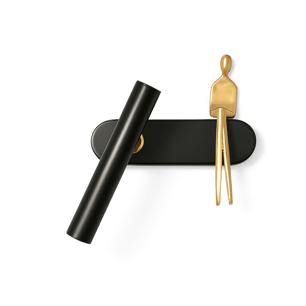 The Stanel Bedside Reading Lamp is a unique light fixture that combines artistic design with functionality. Crafted from brass and iron, this fixture showcases a sleek, modern silhouette with a cylindrical light and a gold figurine perched above, creating a striking visual. Ideal for accent lighting in living rooms, bedrooms, and hallways, its adjustable arm offers focused illumination, while the artistic figurine adds a sculptural element to walls.