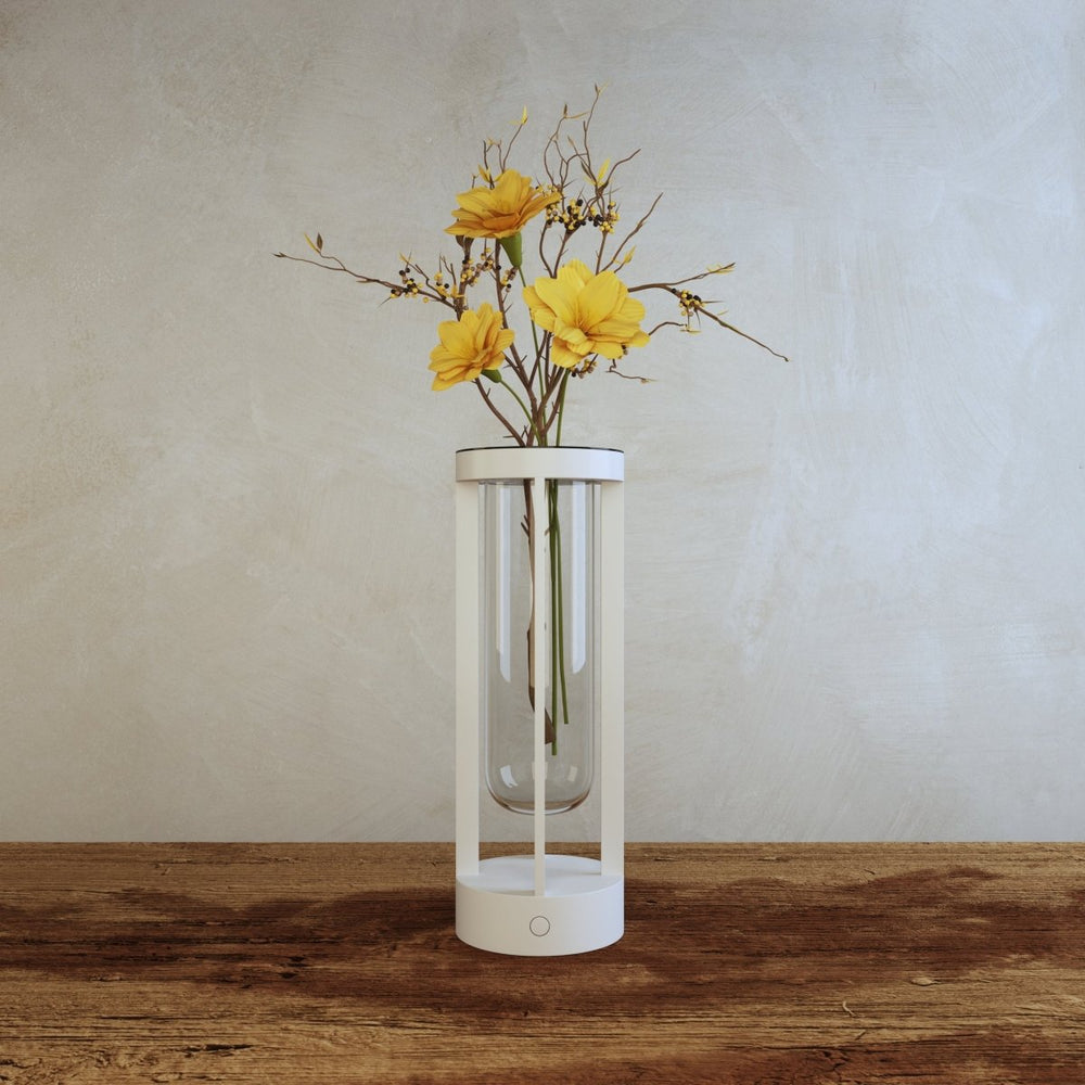 The Svetu Table Lamp is a versatile light fixture made from aluminum, combining a sleek cylindrical design with a built-in vase. Its soft integrated lighting highlights floral arrangements, making it ideal for dining tables, living rooms, or outdoor spaces. This lamp blends elegance and functionality, adding a modern touch to any setting.