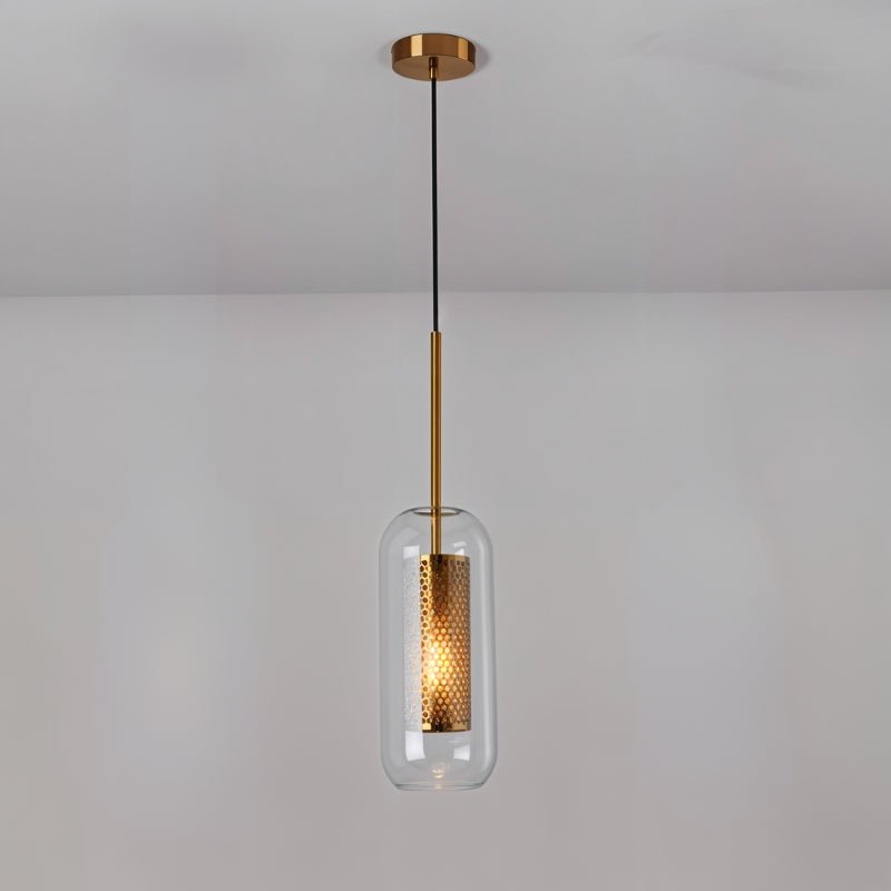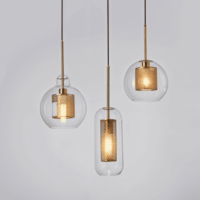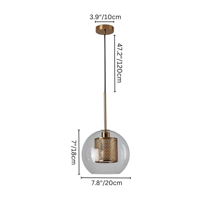 The Theia Pendant Light is crafted from high-quality clear glass and durable metal with a perforated metal interior.
