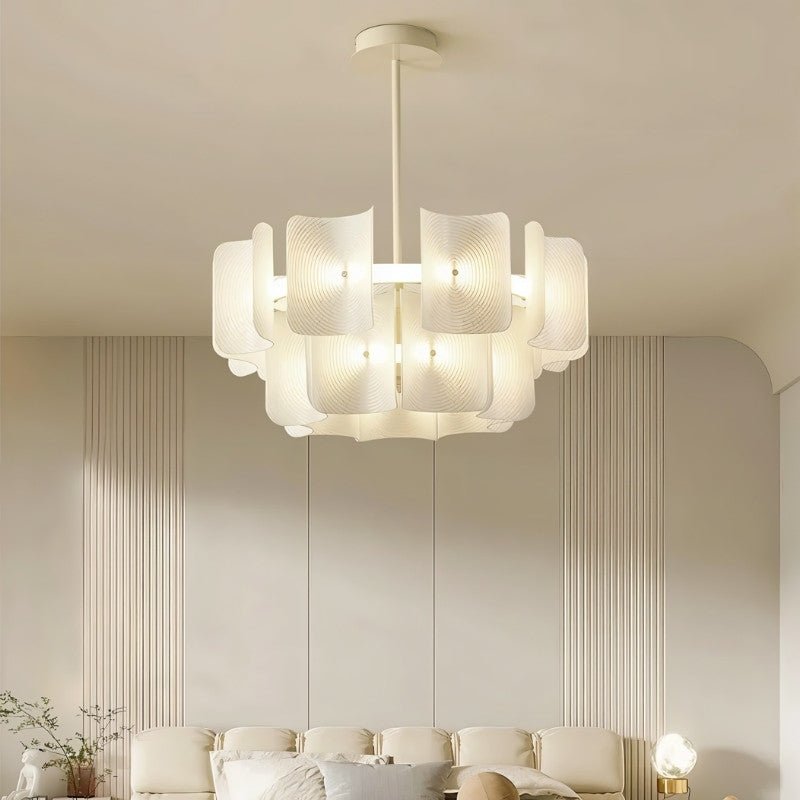 The chandelier is crafted from a sturdy metal frame and layered PVC panels for durability and design appeal.