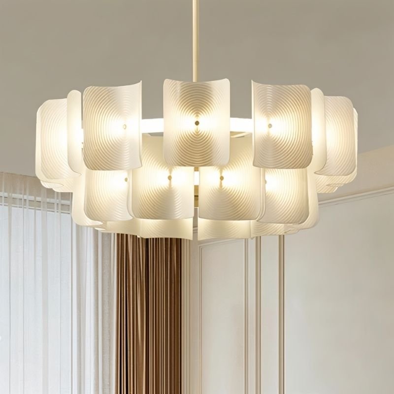 The Tiran Chandelier is a modern light fixture featuring layered PVC panels with concentric textures, creating a striking interplay of light and shadow. Its sturdy metal frame ensures durability, while the sculptural design adds a bold statement to dining rooms, living spaces, and entryways. The diffused glow enhances interiors with soft ambient lighting, making it ideal for both residential and commercial spaces.