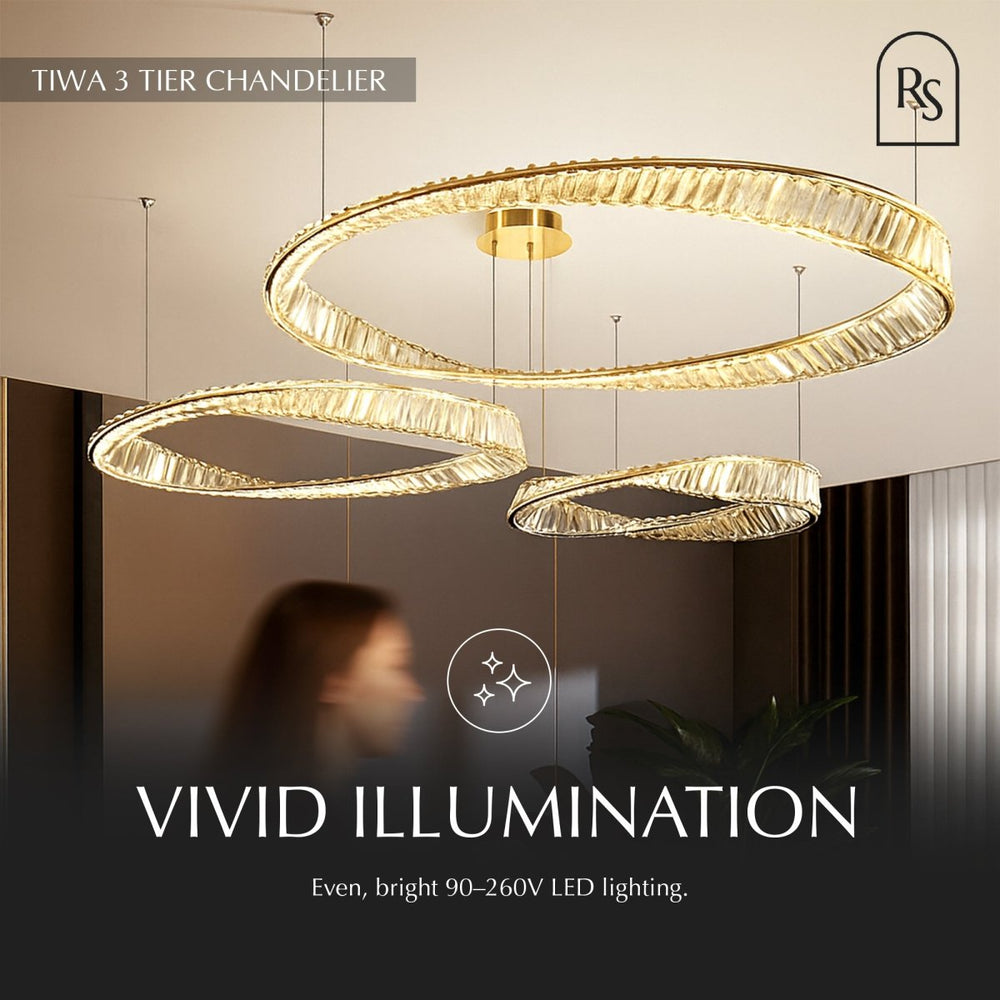 The Tiwa 3-Tier Chandelier is constructed from superior-grade metal and glass crystals.