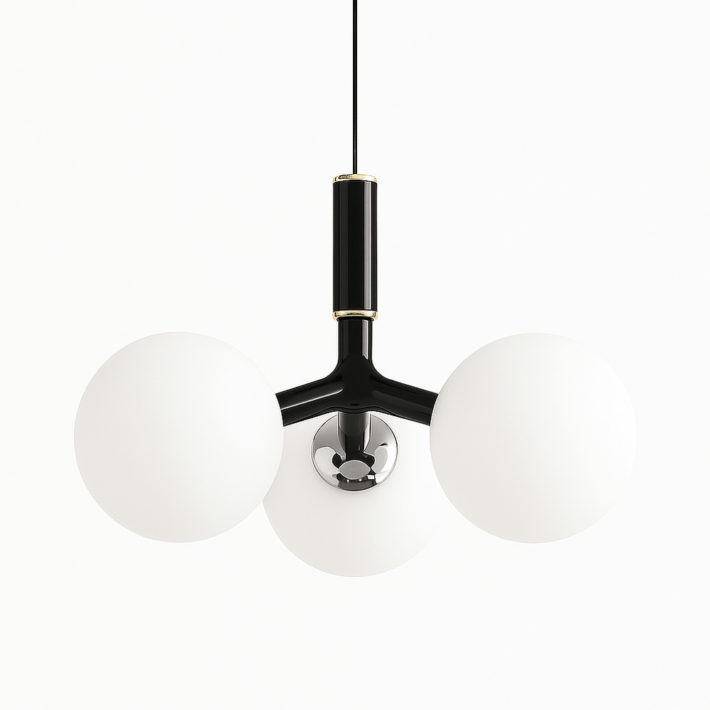 The Trilume Pendant Light features a three-arm aluminum and iron frame supporting opal glass globes, creating a structured yet airy design. Its modern, geometric form makes it ideal for kitchens, dining areas, and contemporary living spaces. The versatile fixture is available in six colors, allowing customization to suit various interiors. Designed for both functionality and style, it provides ambient illumination with a sculptural presence. Suitable for residential and commercial installations, it enhances modern and mid-century aesthetics.