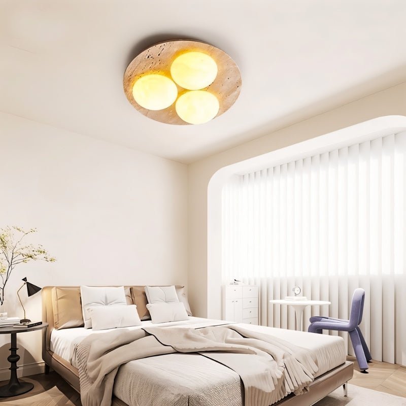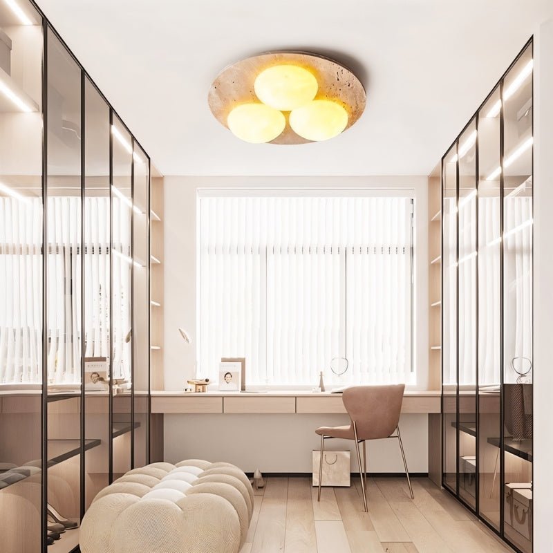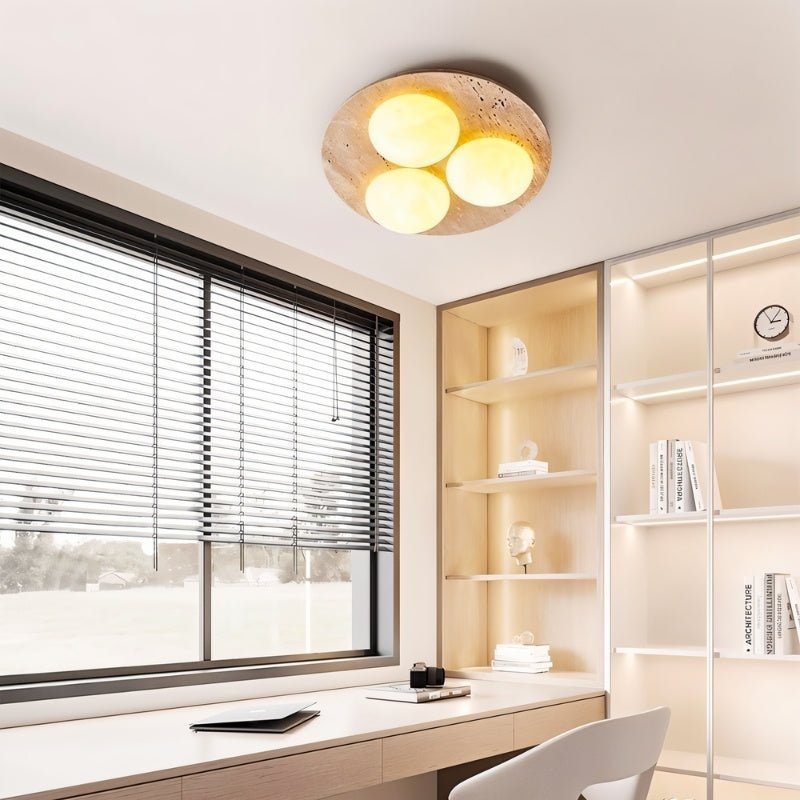 The Twila Ceiling Lamp is a stylish light fixture with a circular travertine base and three opal glass globes that provide a warm, diffused glow. Combining natural texture with sleek design, it suits modern and minimalist interiors. Ideal for living rooms, dining areas, and bedrooms, this lamp enhances spaces with soft ambient lighting. Its unique blend of organic and contemporary elements makes it a statement piece while ensuring functional illumination.