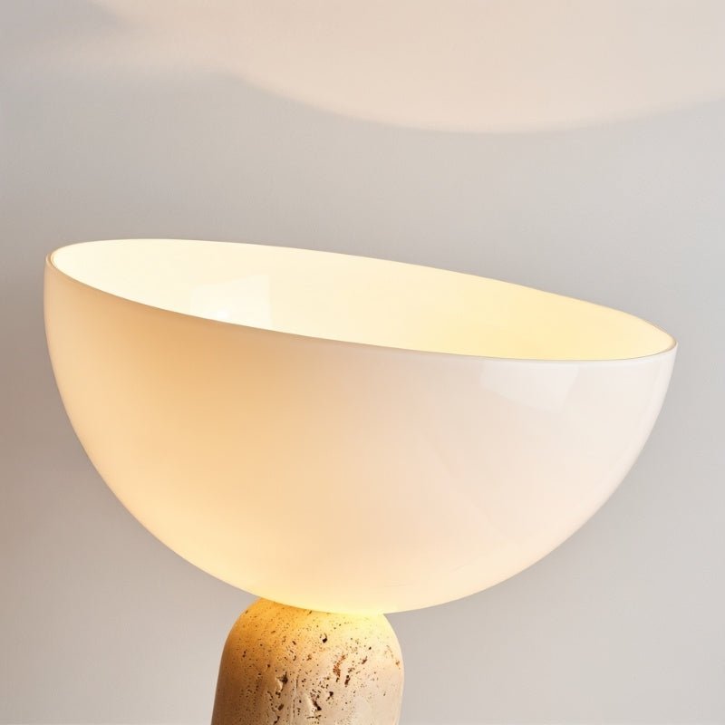 Travertine base and glass shade offer a soft, ambient glow — perfect for desks, nightstands, and enhancing modern interiors.