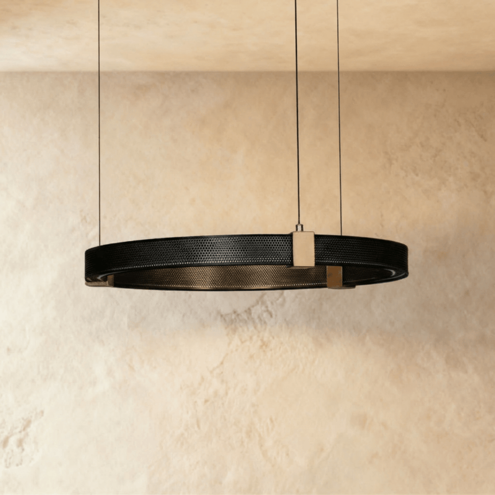The Uriah shifts the tone of a room the moment it comes alive. The perforated aluminum ring filters the glow before it reaches you, so the light feels measured instead of exposed. Acrylic diffusers soften the brightness further, allowing it to wrap gently beneath the circle. When suspended lower over a table, it gathers the space inward. When lifted higher, it opens the room and lets the light breathe. The effect is controlled, but never cold.