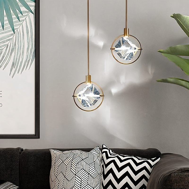 The Valvo pendant light is a modern light fixture featuring an elegant circular iron frame with a suspended crystal cube. The transparent crystal refracts light beautifully, creating striking ambient effects. The minimalist gold finish complements contemporary and luxury interiors. Ideal for dining areas, living rooms, bedrooms, or high-end commercial spaces, this pendant light enhances any setting with its sophisticated design and focused illumination. Its adjustable suspension allows versatile installation, making it a statement piece in modern lighting décor.
