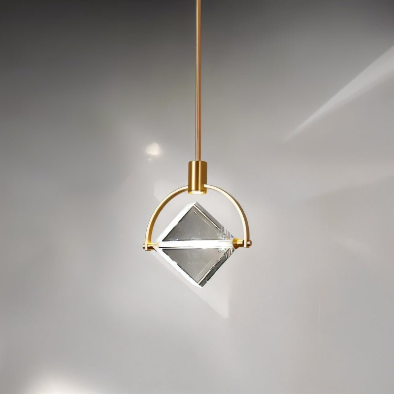 - Sleek gold frame with a suspended crystal cube for sophistication.