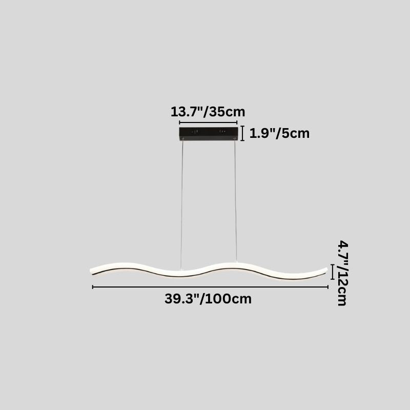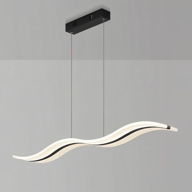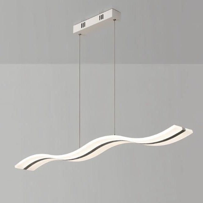 The Venzor Pendant Light is a modern light fixture featuring an undulating wave design crafted from iron and acrylic. Suspended from a rectangular base, its sleek, sculptural form integrates seamlessly into dining areas, living rooms, and kitchens. Available in two sizes, two designs, and two colors, it adapts to diverse interior styles. The integrated LED strip runs along the curvature, casting a uniform, glare-free glow. Ideal for contemporary spaces, this pendant light fixture adds a dynamic visual element to any setting.