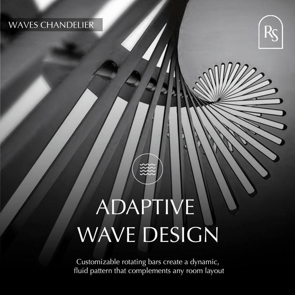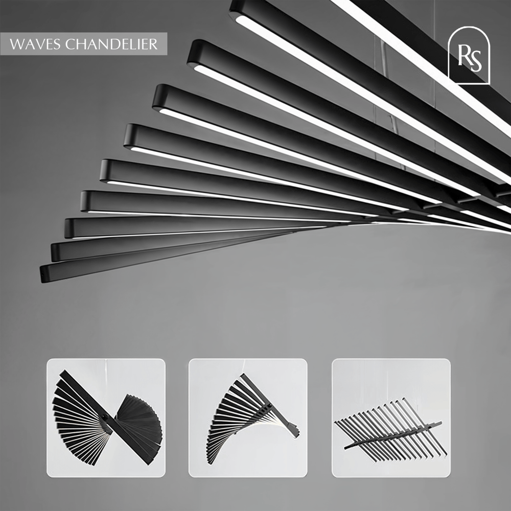Waves Chandelier is the centerpiece that impresses guests with its signature pattern. The center axis allows for the rotation of each bar making every fixture flow with your room's design. Design it your way whether it be for the stairway or kitchen island. Ideal for offices, living areas, kitchens, stairways, and dining areas.