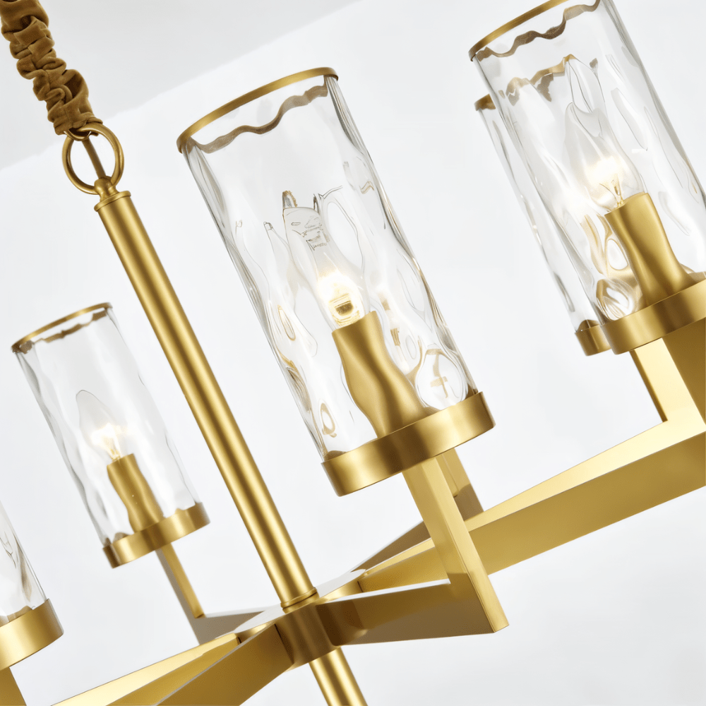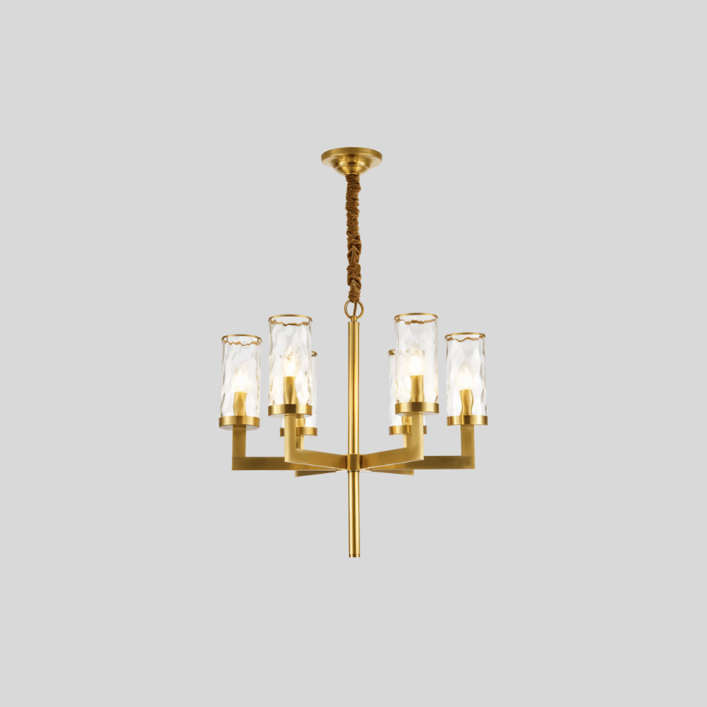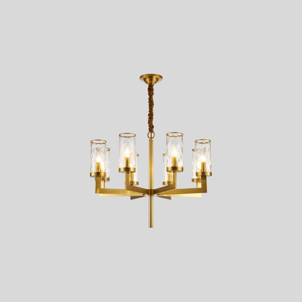 Wynlo Chandelier is a sculptural light fixture crafted from premium copper and crowned with wavy-edged glass lampshades. Its bold geometric arms radiate from a central stem, delivering modern symmetry with a luxe gold finish. The flame-style bulbs enhance ambiance through textured glass diffusers. Ideal for living rooms, dining spaces, or foyers seeking a dramatic lighting centerpiece. Designed to accommodate both intimate and spacious interiors with versatile scale options.