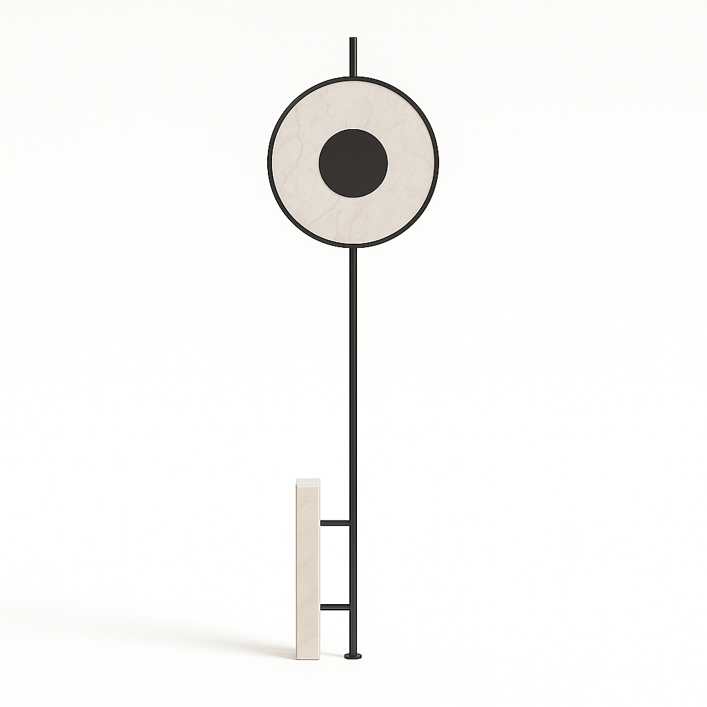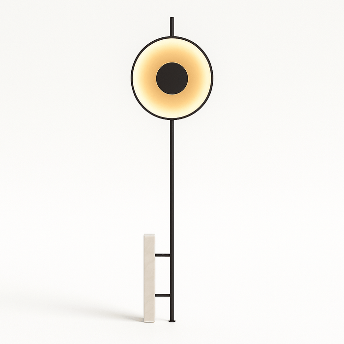 The Xyloft Floor Lamp is a sculptural light fixture combining metal and stone, featuring a circular, halo-like LED design. Its asymmetric structure balances geometric precision with organic contrast, available in two color variations. Ideal for modern interiors, it functions as an ambient light fixture in living rooms, hallways, or creative spaces. The integrated LED casts a diffused glow, enhancing architectural aesthetics. Designed for both residential and commercial settings, it serves as a statement piece.