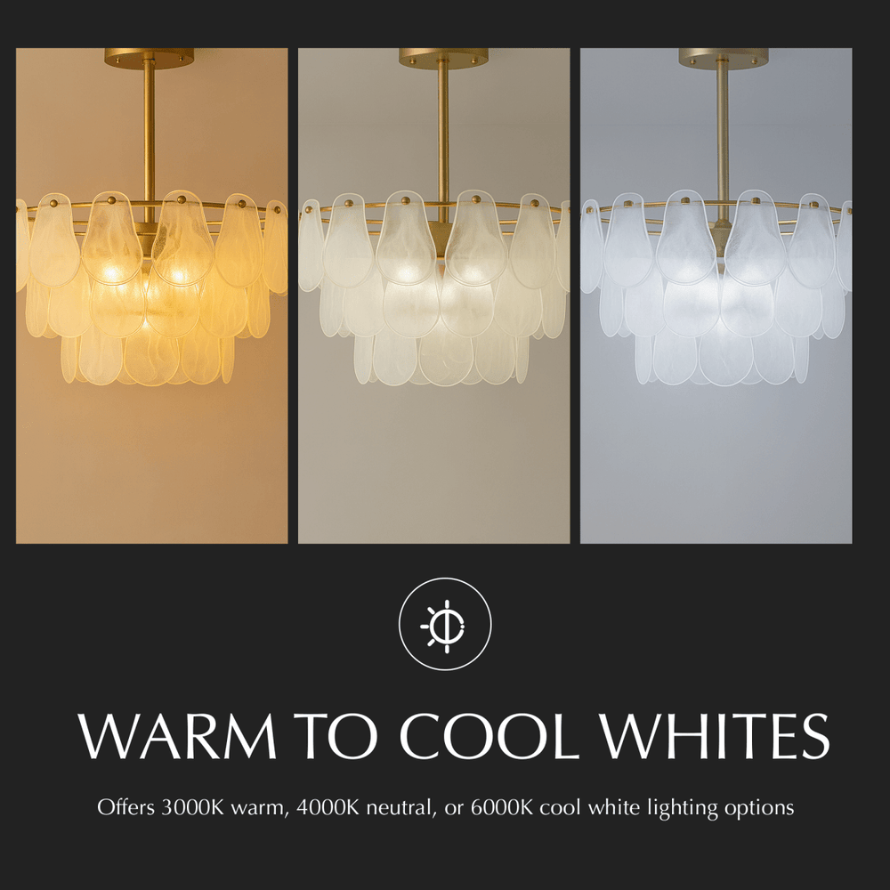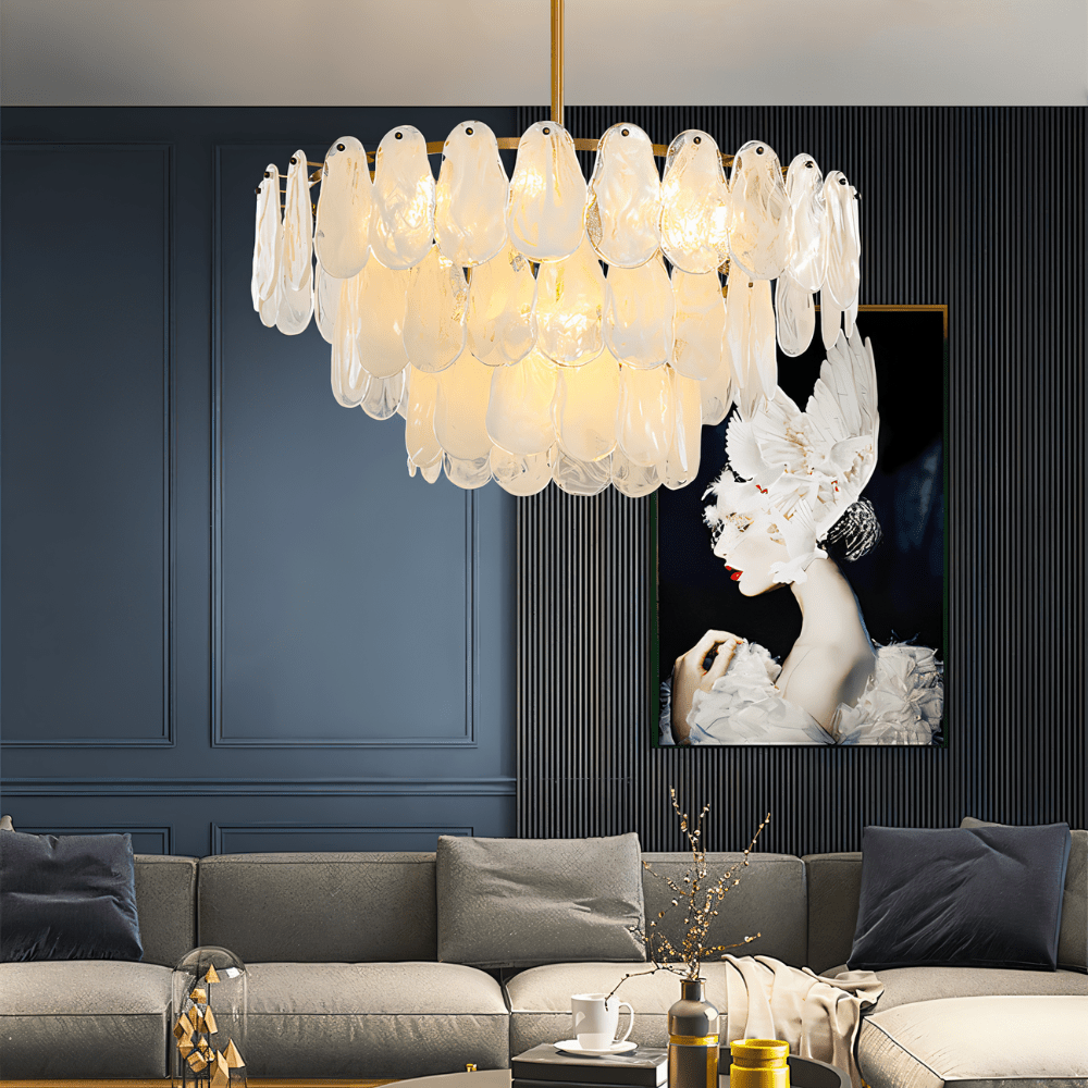 The cascading glass design diffuses light softly, creating a warm, luxurious atmosphere in any space.