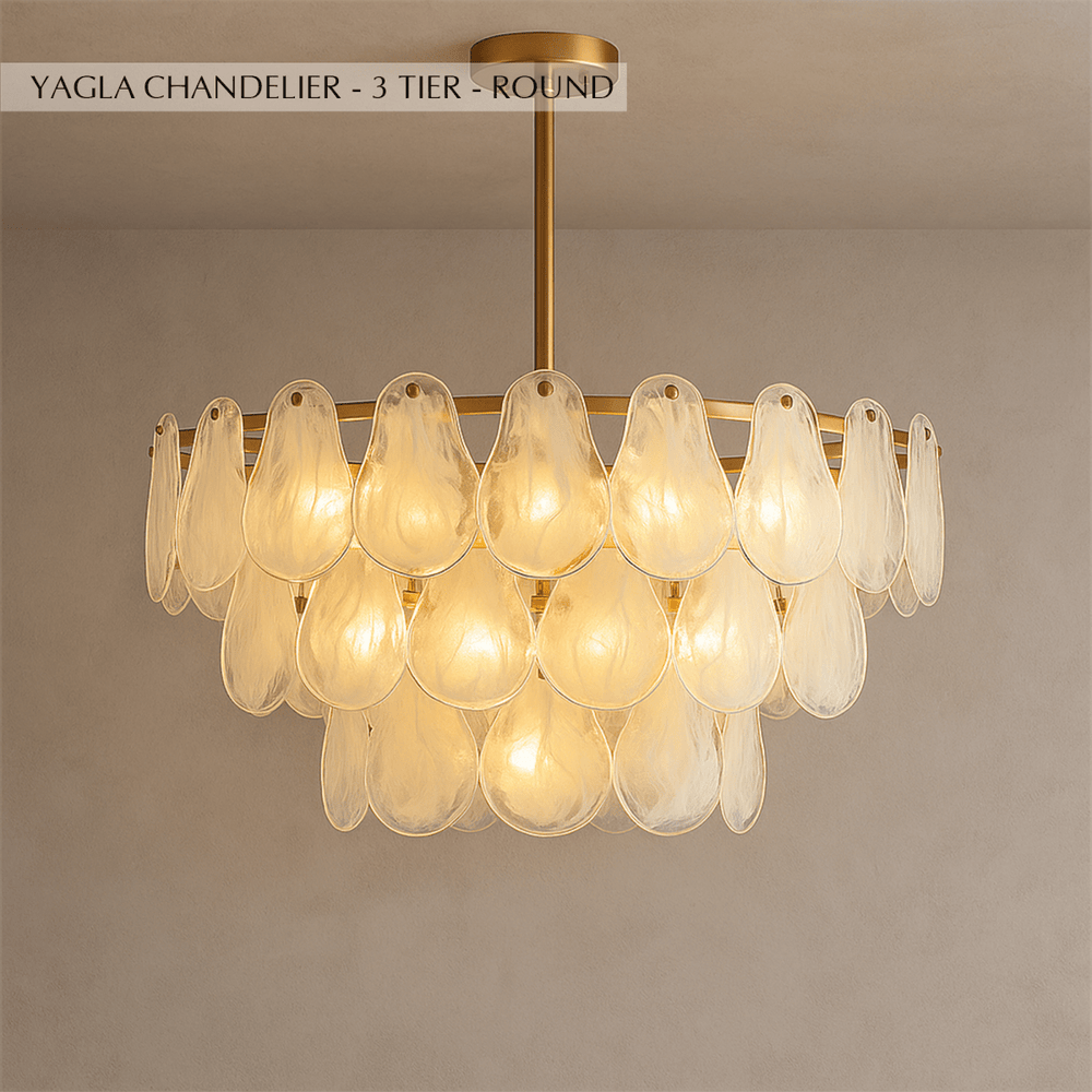 The Yagla Chandelier is a sophisticated light fixture crafted from premium copper and adorned with hand-blown glass lampshades, arranged in fluid, cascading tiers. Its unique teardrop glass elements produce a soft, diffused glow that enhances any room with a luxurious ambiance. This fixture is available in 3- and 4-tier round configurations, as well as a 2-tier linear style, catering to both dining and living spaces. Ideal for contemporary and modern interiors, its elegant design doubles as a statement centerpiece. Suitable for installation in dining rooms, living rooms, or foyers.