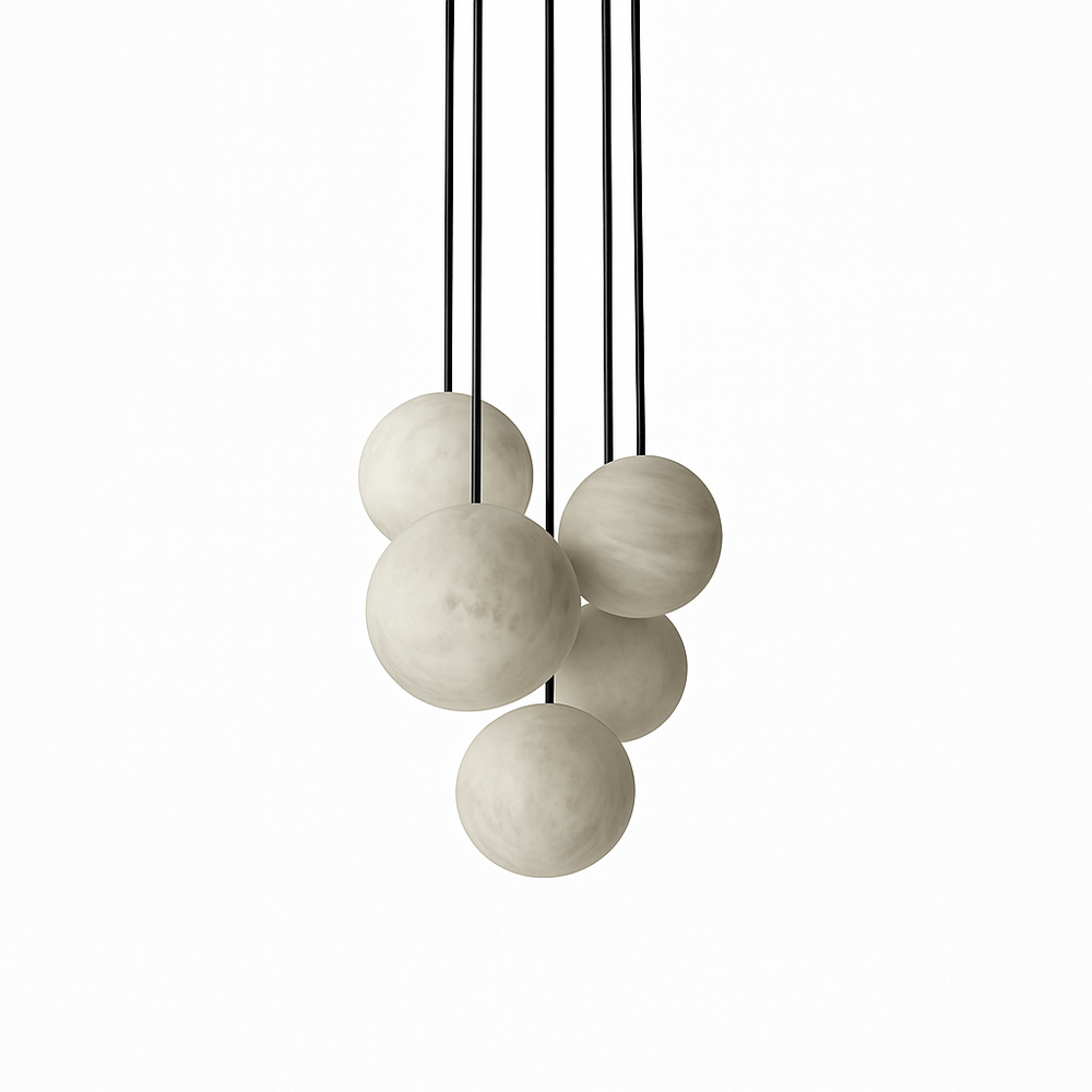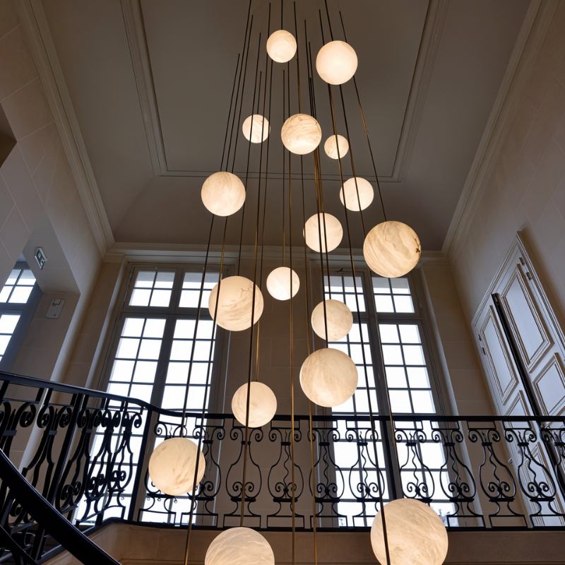 This collection features a metal and alabaster frame, showcasing a simple yet powerful design of a rod and sphere. This iconic centerpiece inspires creativity with its versatility, allowing for various arrangements in terms of size, quantity, and adjustable drop heights.